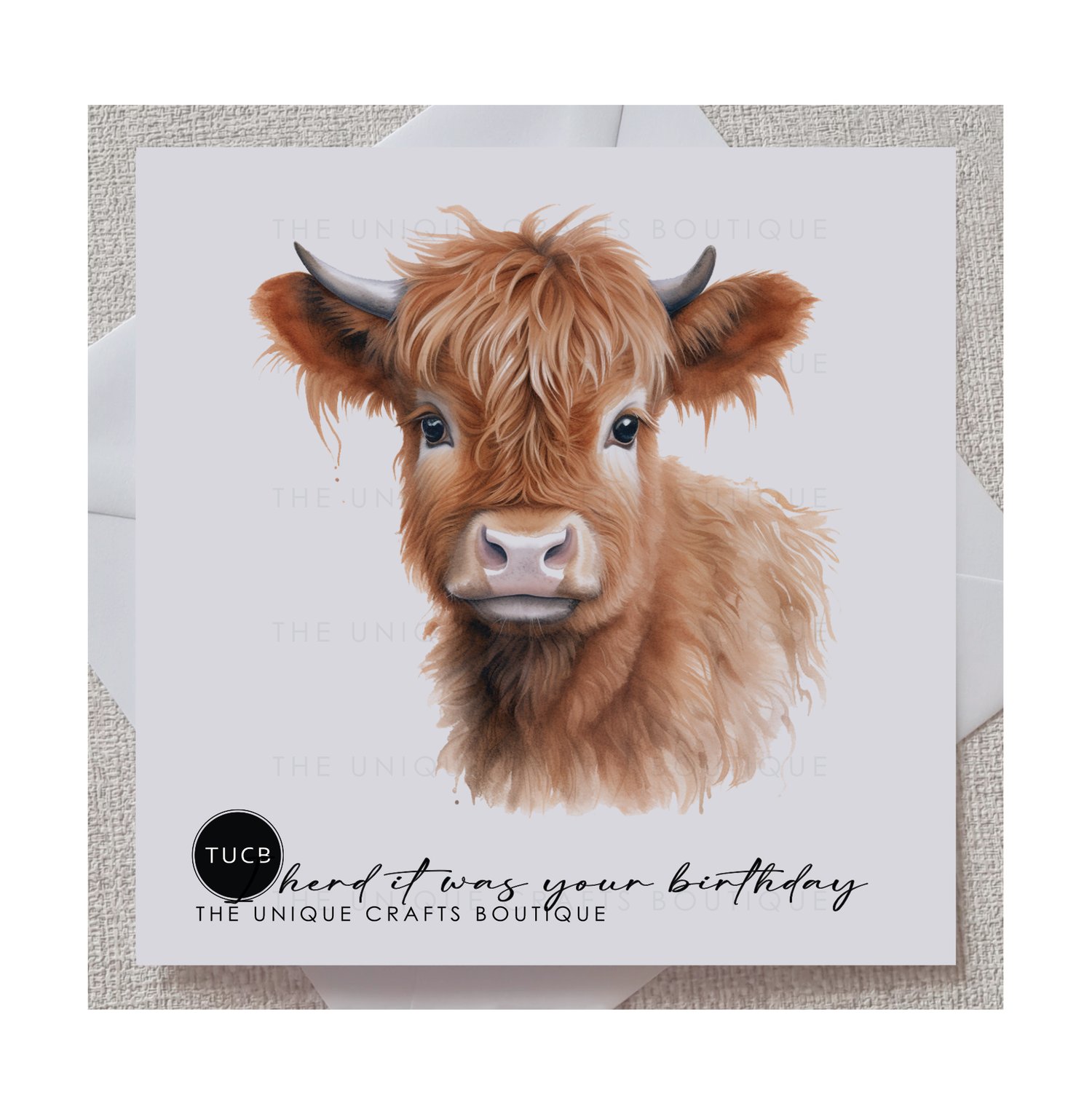 Printed with a cute highland cow and displaying the message, 'I herd it was your birthday' this card is certain to make any recipient smile.