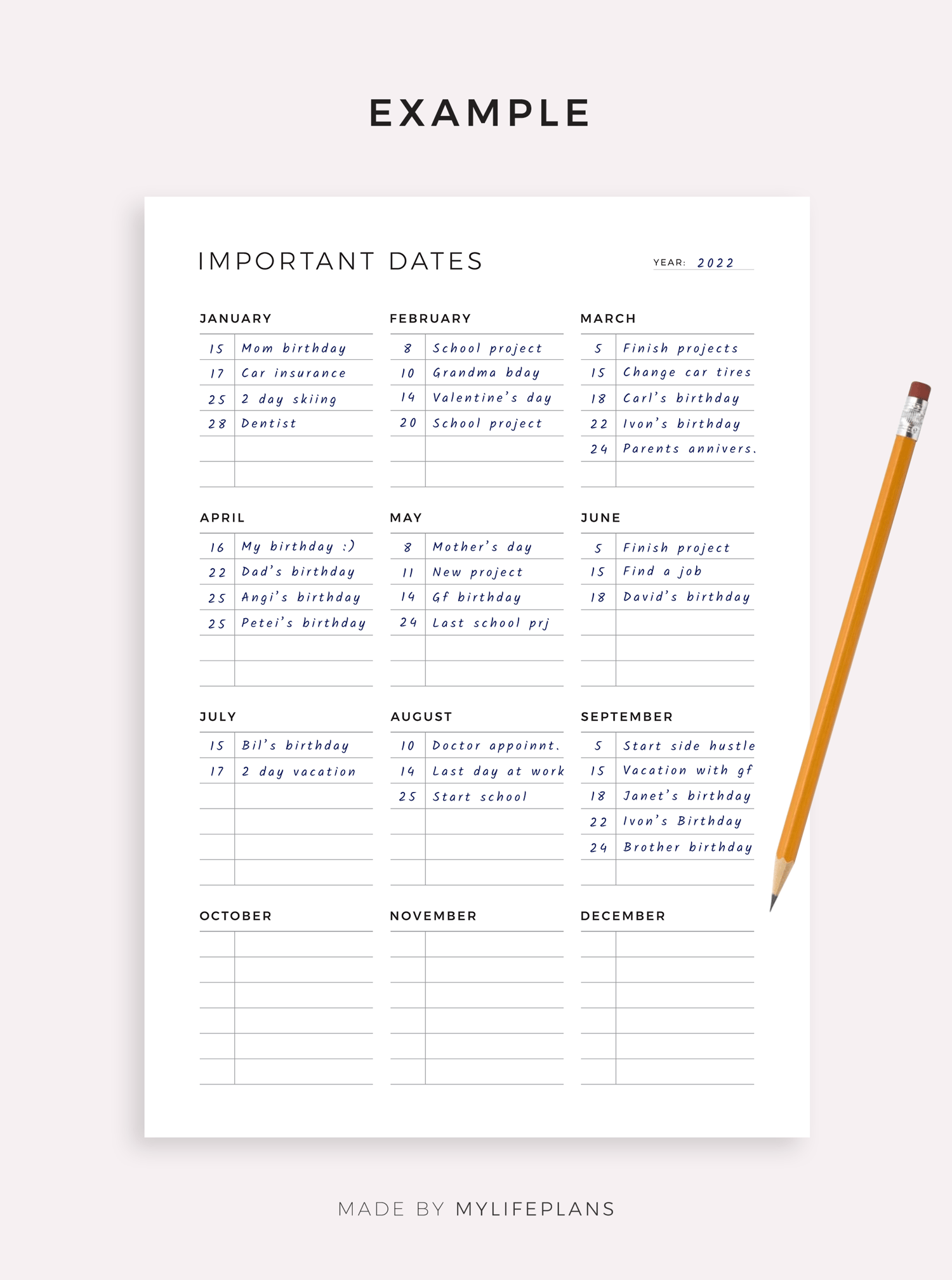Yearly Important Dates Printable - Birthdays, Anniversaries, Travels, Parties, Doctor Appointments, Car Maintenance, ect, A4/Letter Size