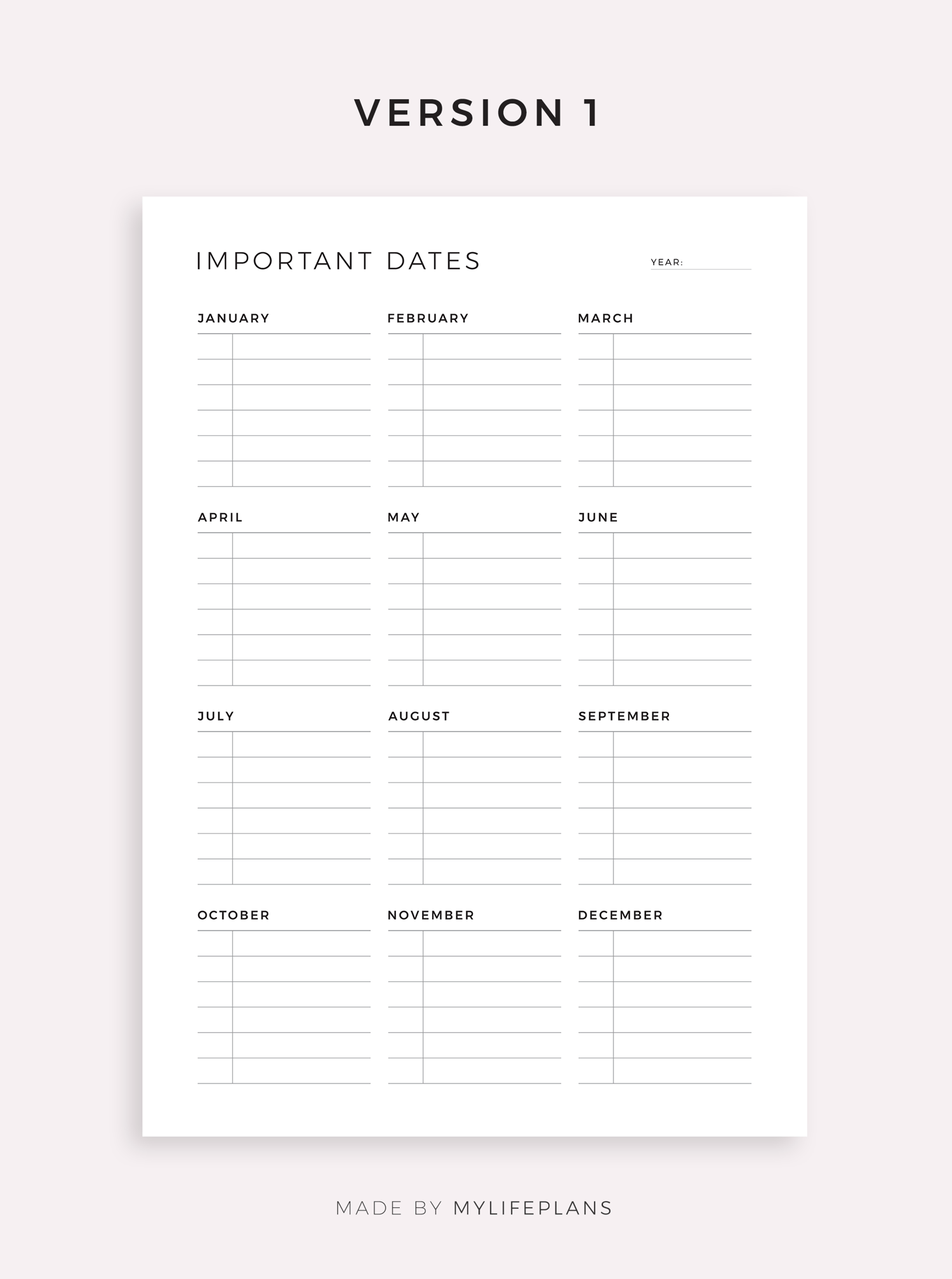 This is a printable important dates planner — just download, print, and start using it right away.