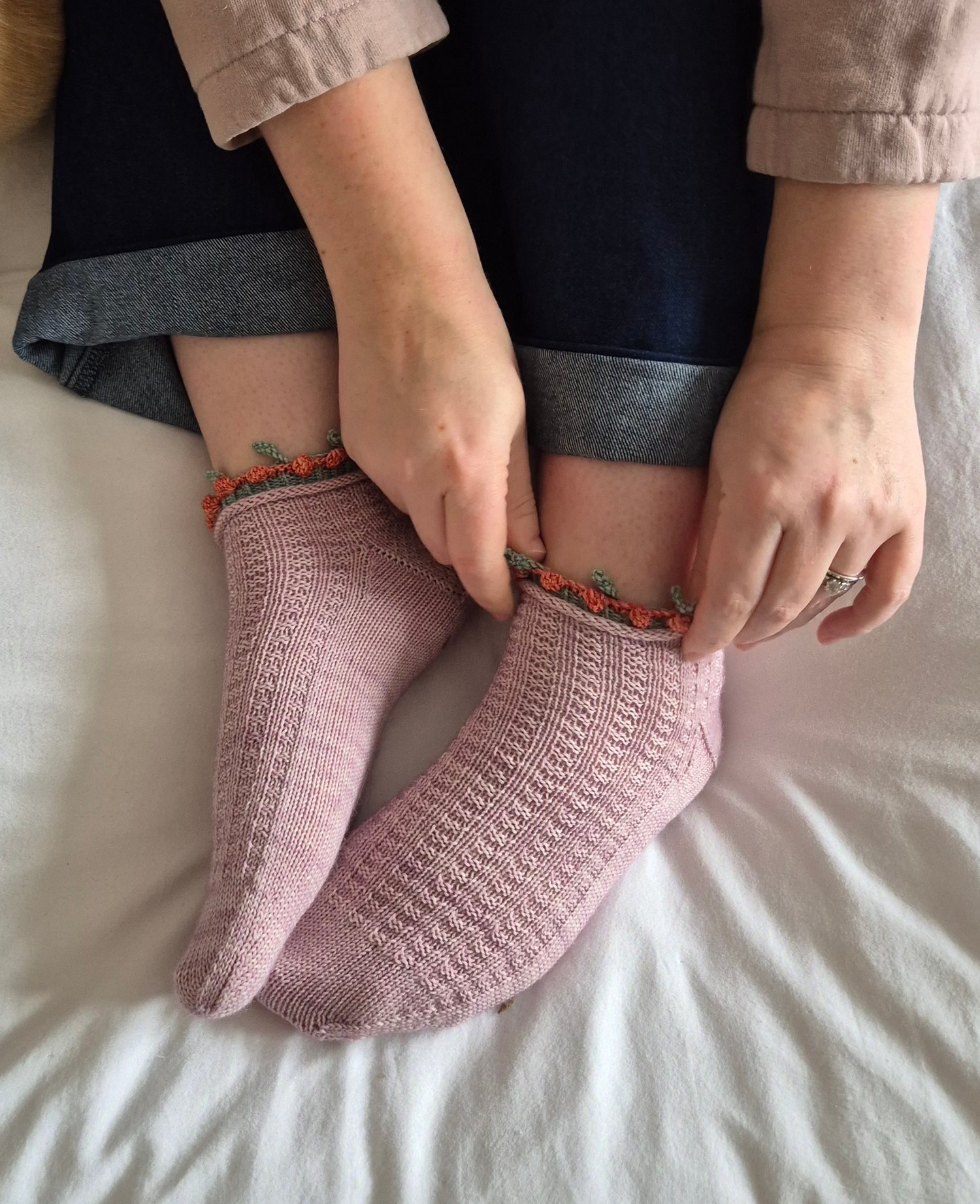 Inspired by a trip to the pumpkin patch on a chilly Autumnal afternoon, the focus of these socks is the whimsical layered cuff. There is no sewing involved to join the layers together, just knitting. Pumpkins and their curling vines delicately sit at the cuff moving into a basket weave pattern down the rest of the sock. The final details are an eye of partridge heel and a rounded toe, two of my favourite elements for a well fitting sock. I used a vintage inspired colour palette for my socks but they would look wonderful in classic, bright Halloween-y colours, or how about a speckle or self-striping yarn for the ‘basket’ part of the sock. I can’t wait to see what colours you use for this playful design.
