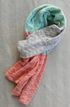 This straightforward rectangular wrap is knitted in two identical pieces, end to center, with an unchanging stitch amount, whilst you work through the various knit purl patterns and colours, and joined together in what becomes the central ‘single’ section .