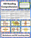 Each sheet contains 4 accessible paragraphs with comprehension questions suitable for KS1 readers.