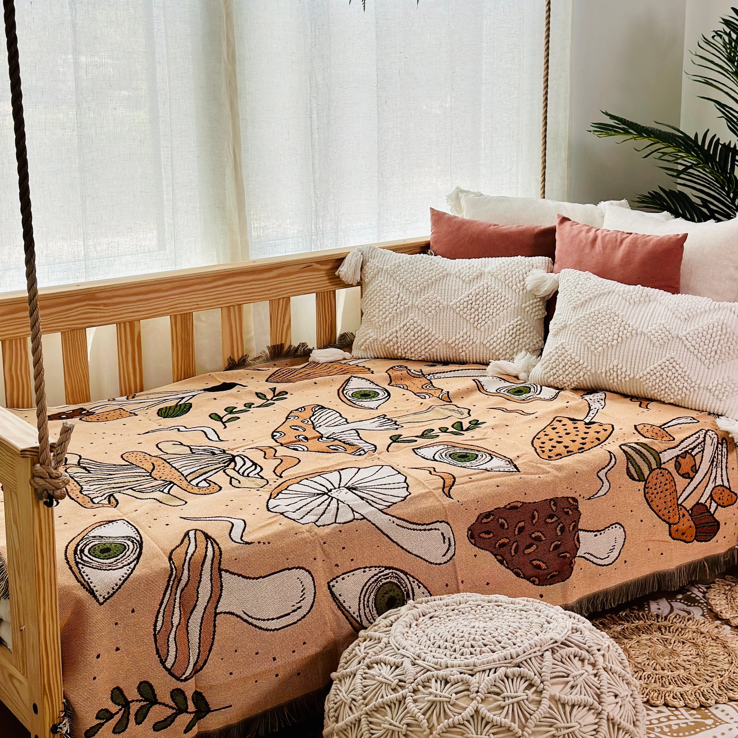 Embrace Whimsical Comfort with the Mystical Mushroom & Eye Woven Throw Blanket