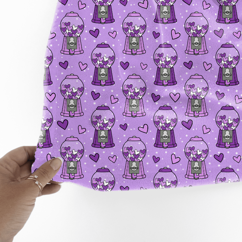 Bubblegum in purple heart shapes with retro bubblegum dispensers.