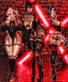 Hair,Fishnets,Thigh boots,Chest belt,Ripped top