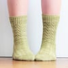 Large: 8.25” / 21cm finished sock circumference. Suggested to fit approximate foot circumference of 9.75” / 25cm, and foot length of 10.75” / 27cm (women’s shoe size US 10.5–13 / EU 43–45)