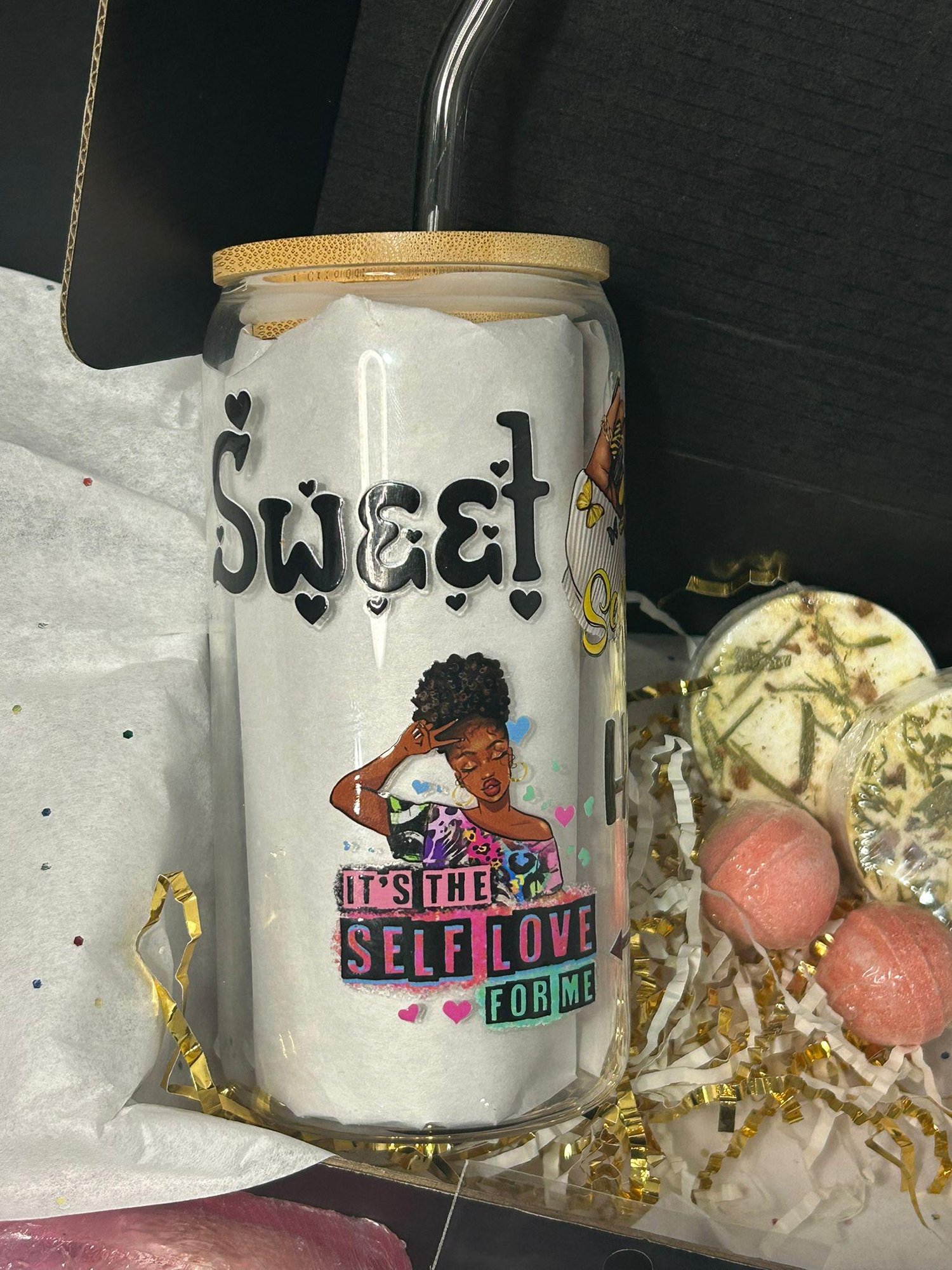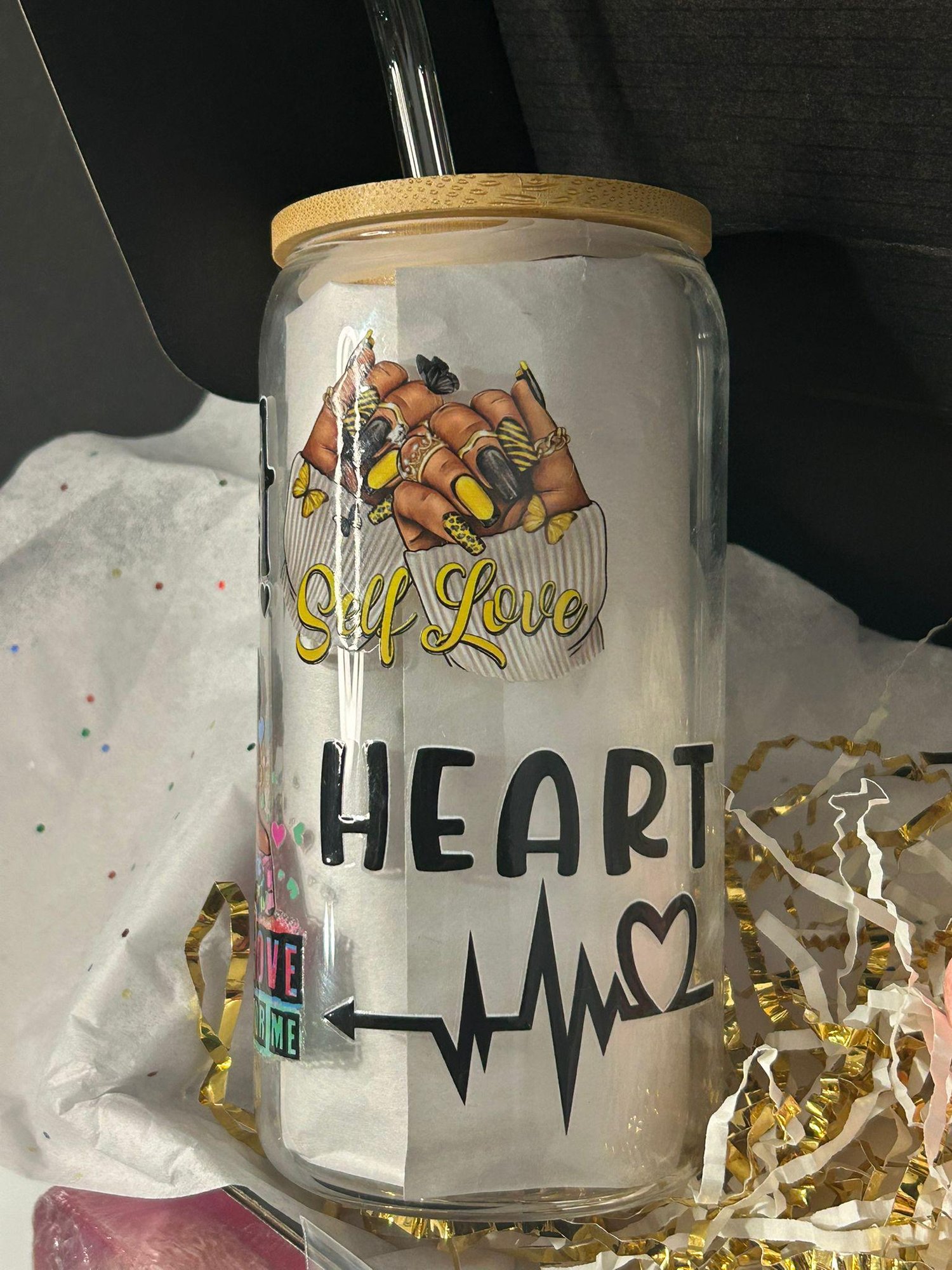 💖 16oz Glass Cup with Bamboo Lid & Glass Straw – Features empowering designs, including "Bold Sweetheart," "It’s the Self-Love for Me," and an illustration of two hands with painted nails—sip in style while embracing self-care.