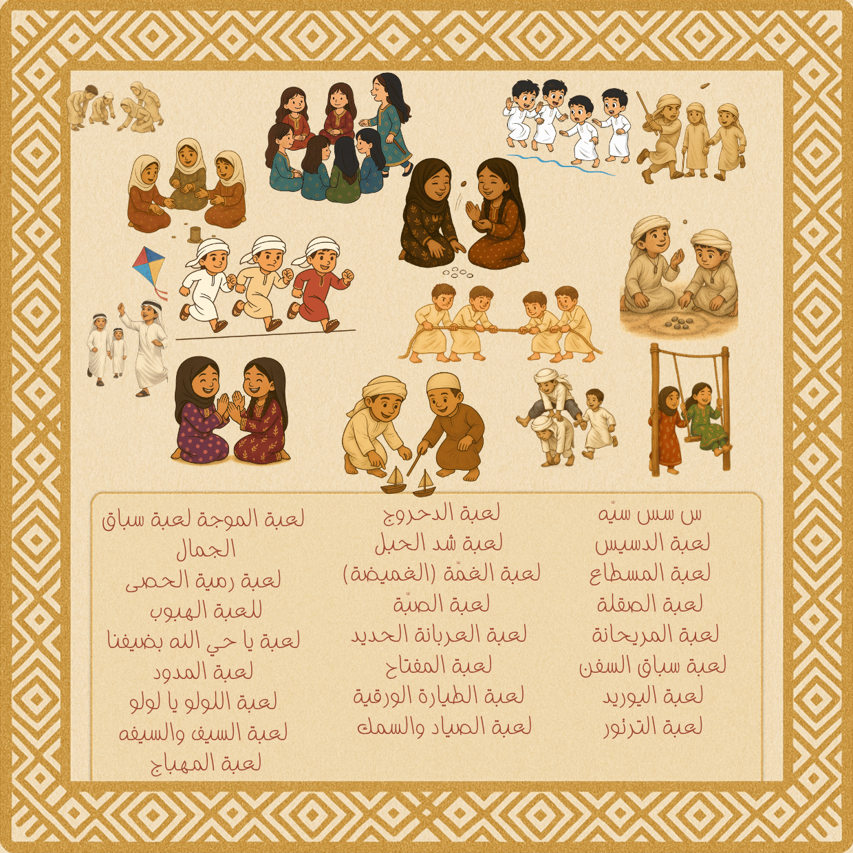 تشمل ألعاب الفريج، البحر، والغناء التراثي، مثل أس سس سيّه، المريحانة، الطيارة الورقية، الهبوب، وغيرها الكثير!