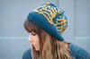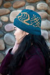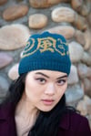 This striking knitted hat pattern incorporates a Japanese kanji character “風 (Kaze)” for the word “Wind.” The motifs continue around the hat just like the beautiful multi-panel screens of Byobu, presenting a series of images related to different aspects of winds. All the images are intersected and come to a full circle at the end.