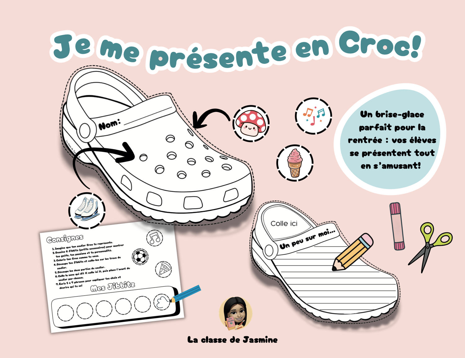Dans cette activité, les élèves personnalisent un soulier Croc en y ajoutant 6 Jibbitz (accessoires) qui représentent leurs goûts, leurs passions et leur personnalité. Ils colorient, découpent et assemblent leur Croc, puis rédigent 5 à 7 phrases pour expliquer leurs choix.