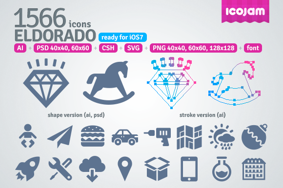 Eldorado contains 1566 vector icons divided into following categories: Baby, Basic, Building, Culture, Devices, Documents, Education, Finance, Food 1-3, Holiday, Layout, Medicine, Mobile, Multimedia, Navigation, Player, Symbols, Transport, User, Weather, Work, Furniture, Appliance.