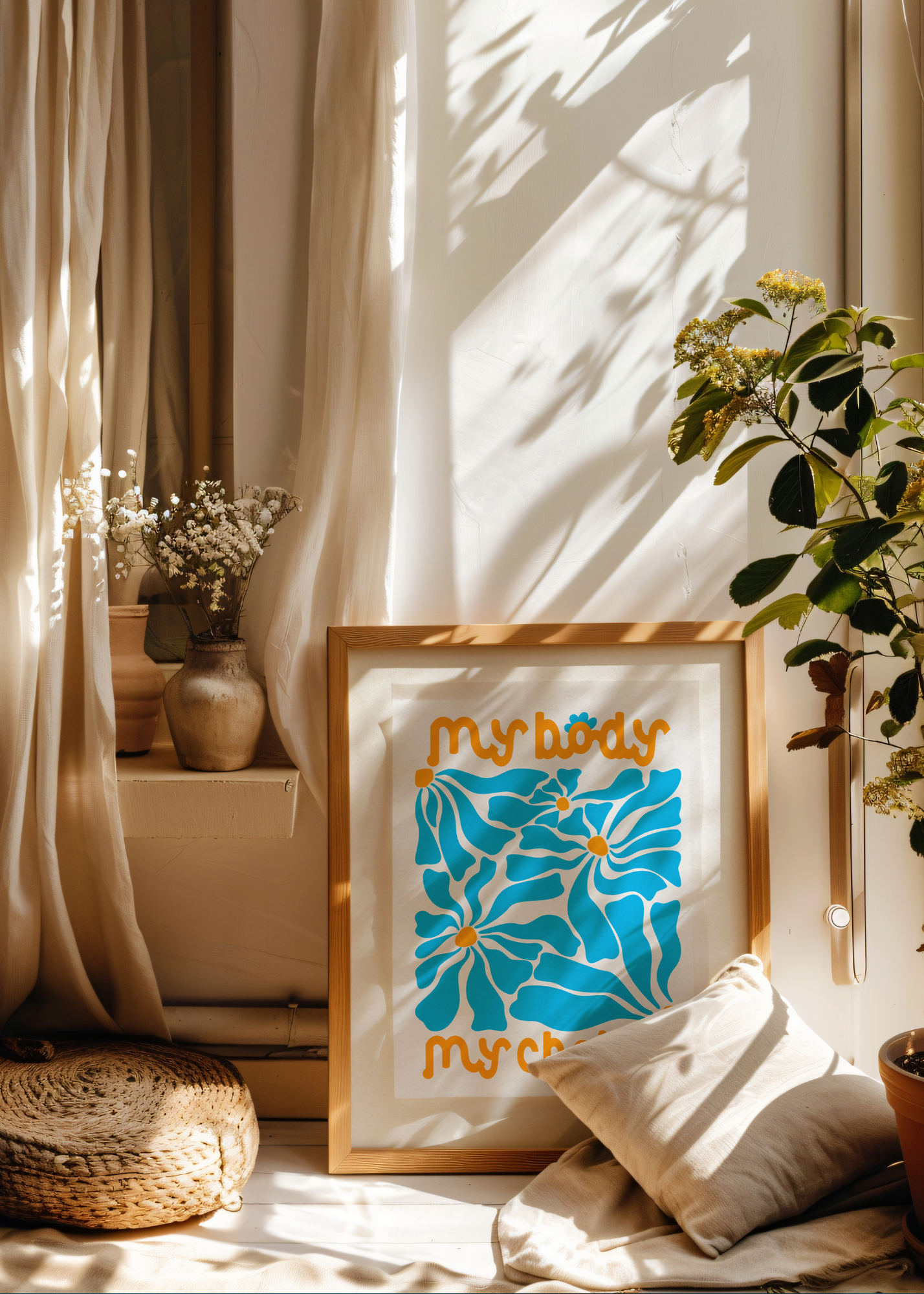 My Body My Choice— Centering strength in softness, these floral prints bloom with the bold declaration: “My body, my choice.” Whether in blue and lime, soft blue and orange, or blue and golden yellow, each one is a reminder that your autonomy is always important. Claim your power.