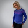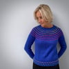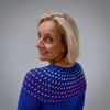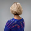 The pullover is worked seamlessly in the round from the top down. Knitting begins with a ribbed neck. The stranded yoke is worked in Gathered Stitch Pattern from a chart or written instructions. Short rows are worked to raise the back before dividing for sleeves. Stitches are held for sleeves, and knitting continues down the body, ending with a ribbed hem. Sleeve stitches are returned to the needles and sleeves are knit in the round from the top down, ending with a ribbed cuff.