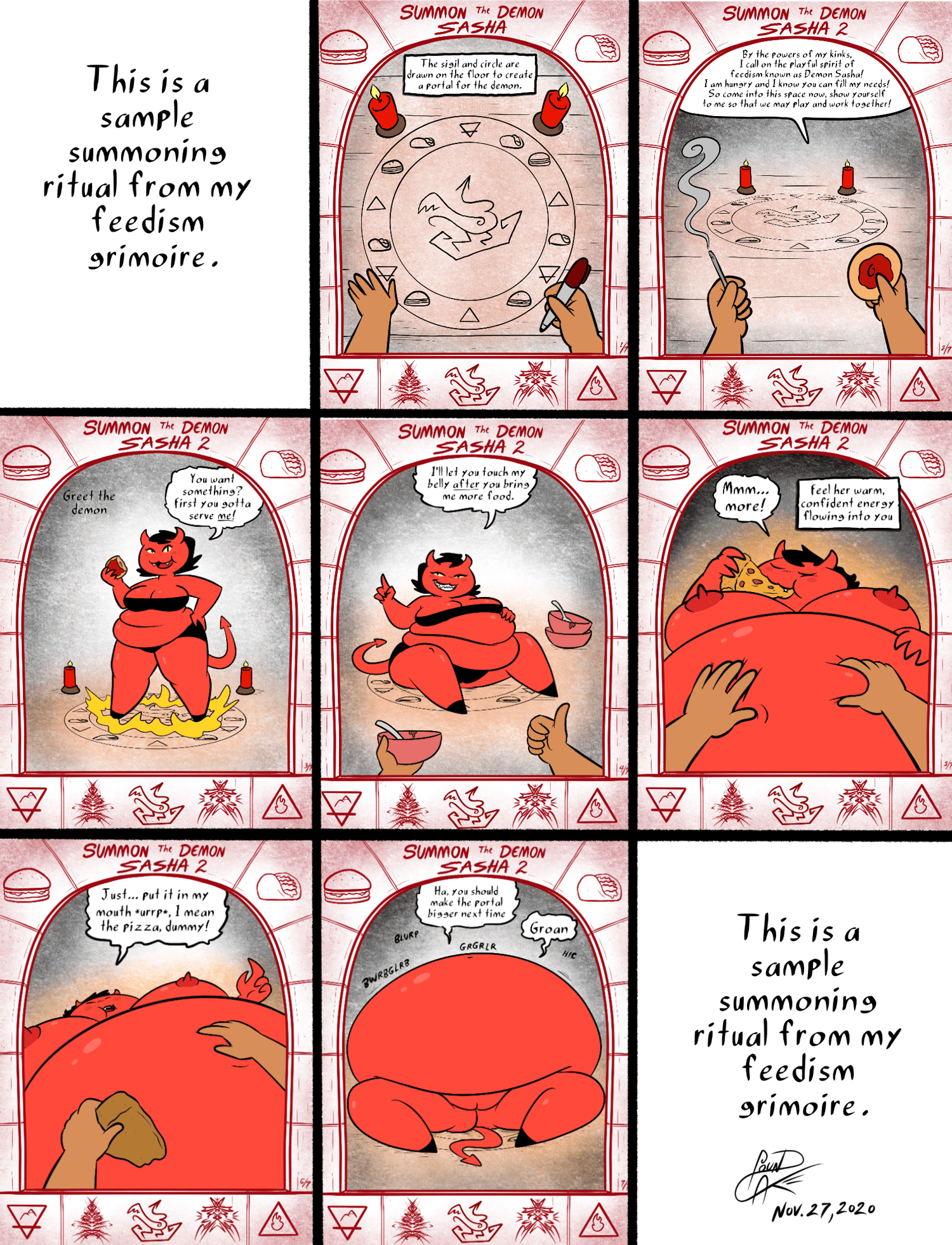 Illustrated rituals for entering the Feedism Temple, summoning an angelic spirit of expansion, and a demonish imp spirit of role playing!