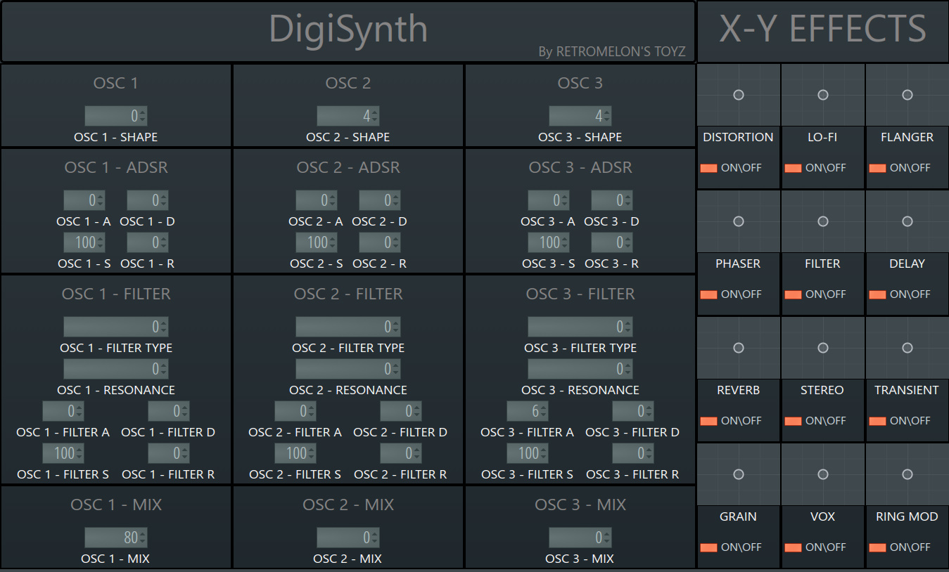 DigiSynth is a custom synthesizer for FL Studio, part of the Retromelon’s TOYZ collection. Built in Patcher, it follows a classic VCO → VCF → VCA → VC Envelope architecture, reimagined with modern digital tools.