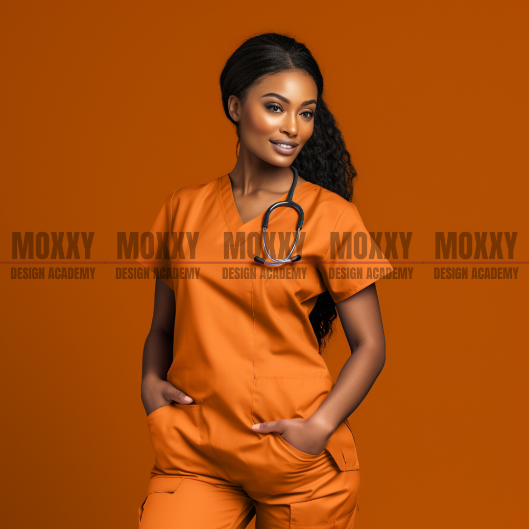Black Nurse Model Orange Scrub Mockup