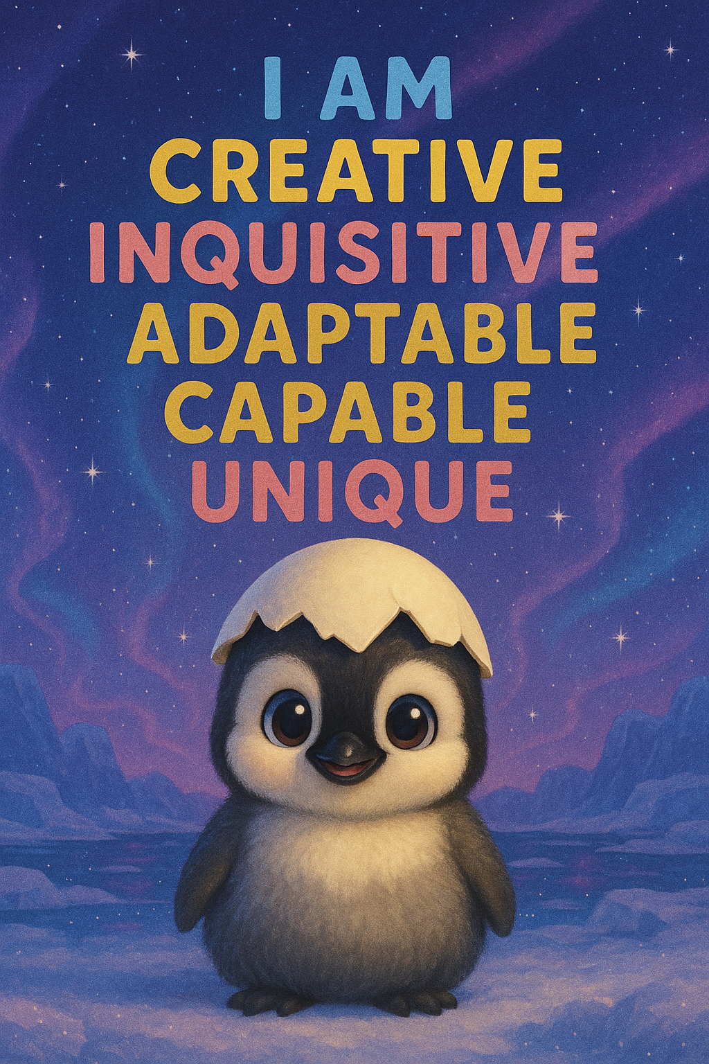 Celebrate the wonder of every child’s unique spirit with this Christian Kids Affirmation Wall Art, illustrated with a newly hatched baby penguin under a starry aurora sky. This printable is ideal for faith-based homeschool decor, nursery walls, and children’s devotional kits, offering a visual and emotional reminder that each child is divinely designed to be creative, curious, and strong.