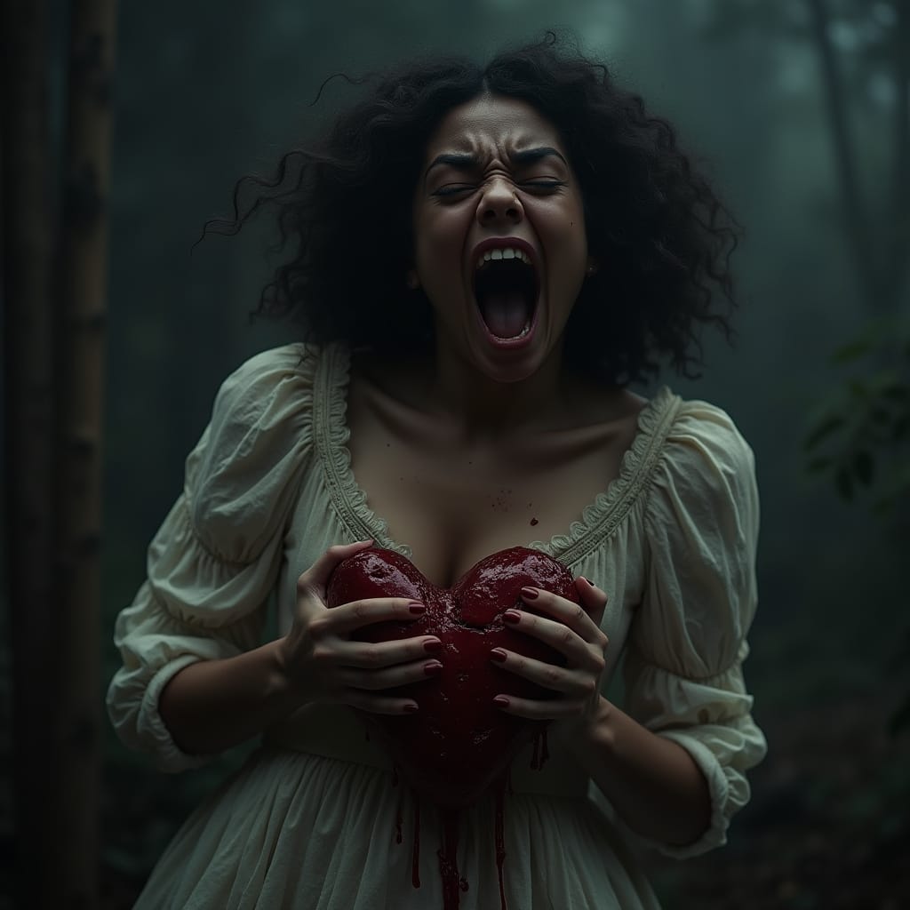 A visceral portrait of anxiety—raw, haunting, and unforgettable. The image of a woman clutching her bleeding heart embodies the crushing weight of fear and inner turmoil. A bold statement piece that captures the silent scream within.