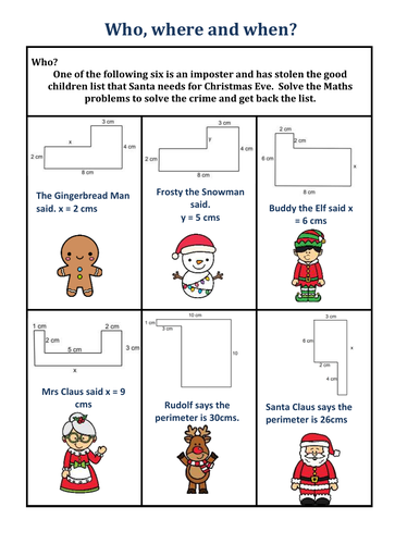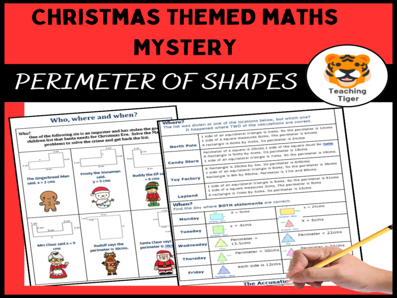 In this captivating math murder mystery, students embark on a journey to solve perimeter problems, including squares, rectangles, compound shapes, and various types of triangles, such as equilateral and isosceles. π By correctly answering questions, they unravel clues and crack the case of the Christmas mystery! π΅οΈββοΈ