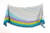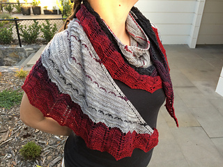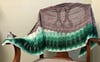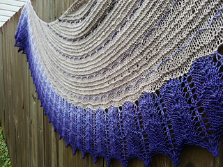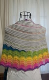 6 skein shawl: 18.5” deep by 88” long at BO edge