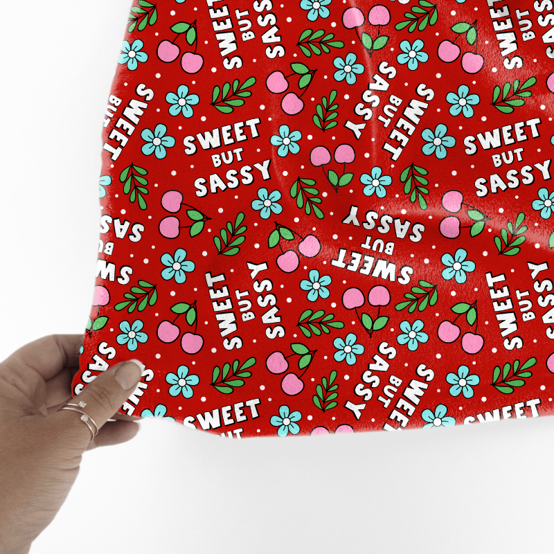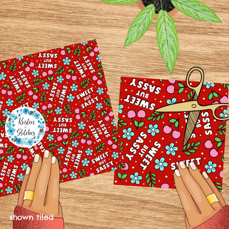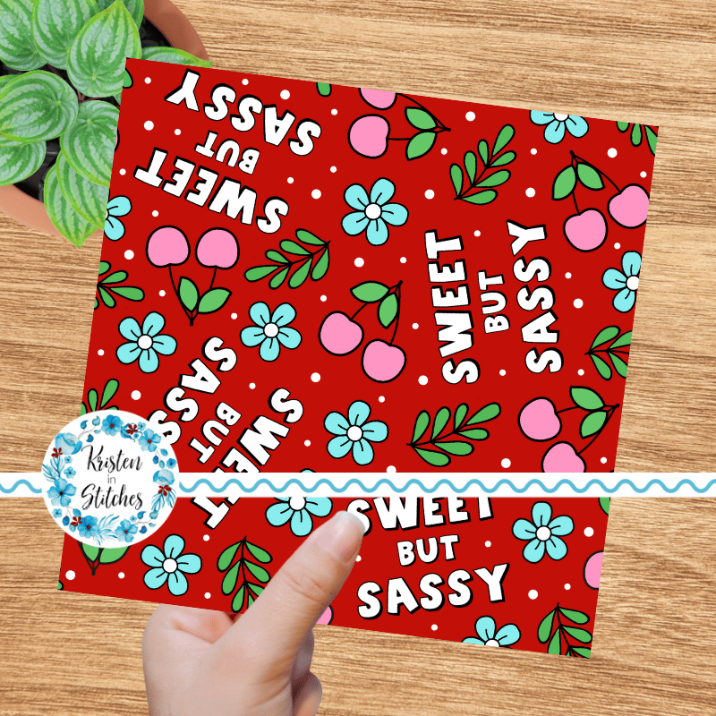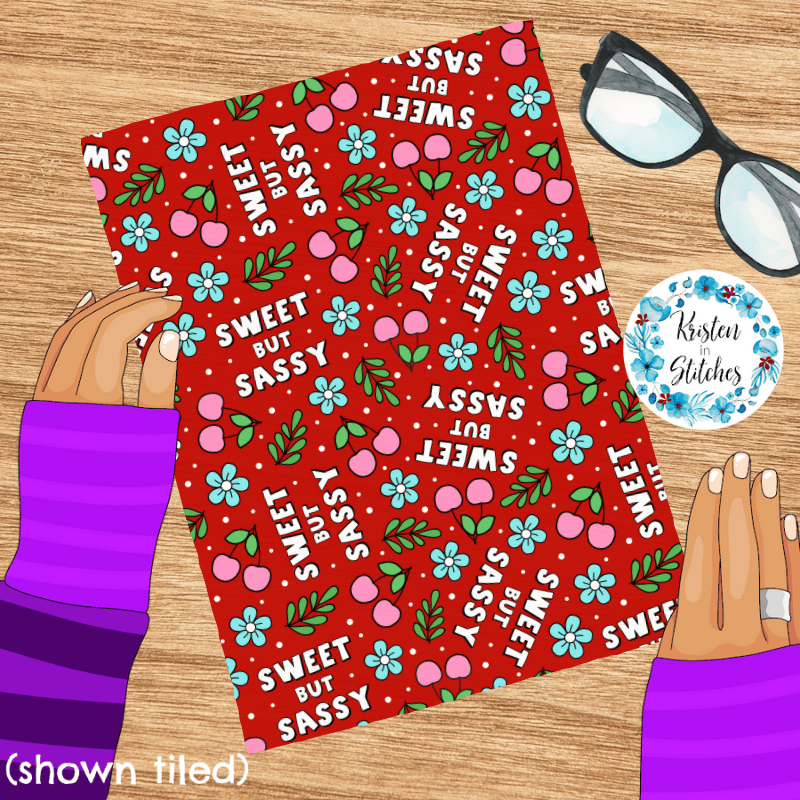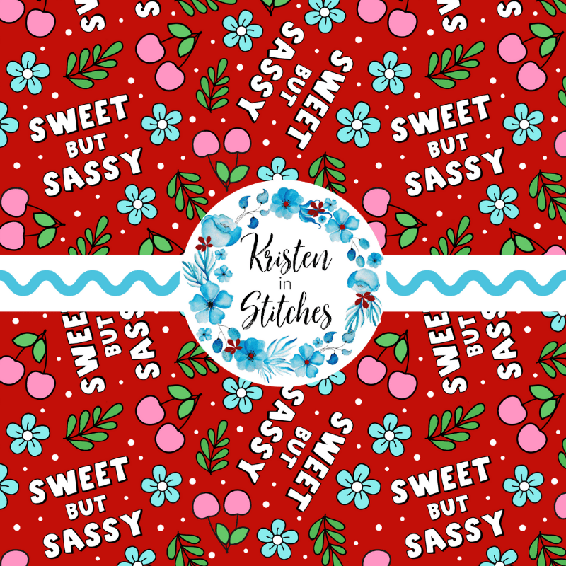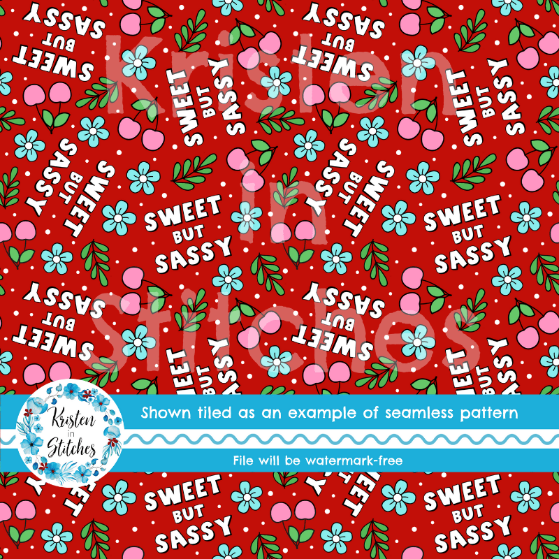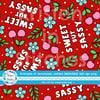 Sweet But Sassy seamless pattern with cherries and white daisy flowers.