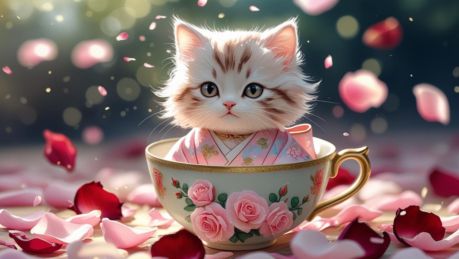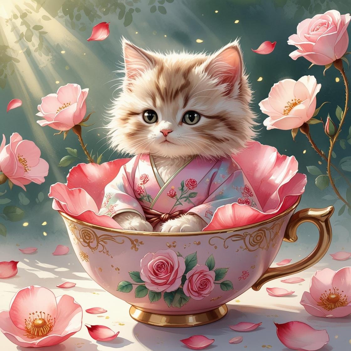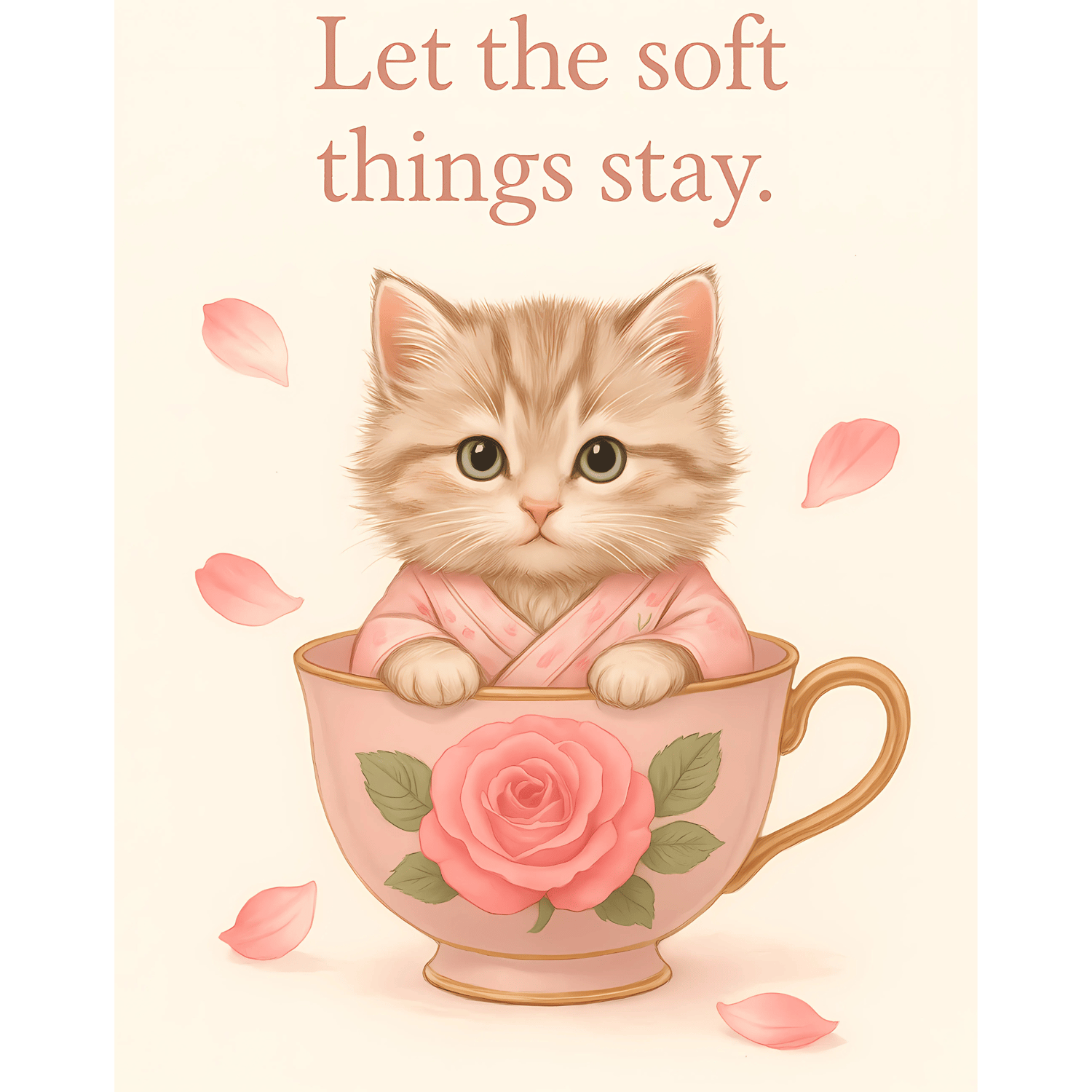 This month’s Meowmoji printable set features a soft, wide-eyed kitten wrapped in a pastel floral kimono, gently cradled in rose-trimmed teacups. With petals floating all around and golden light filtering through, these cozy illustrations capture the tender charm of love in full bloom.