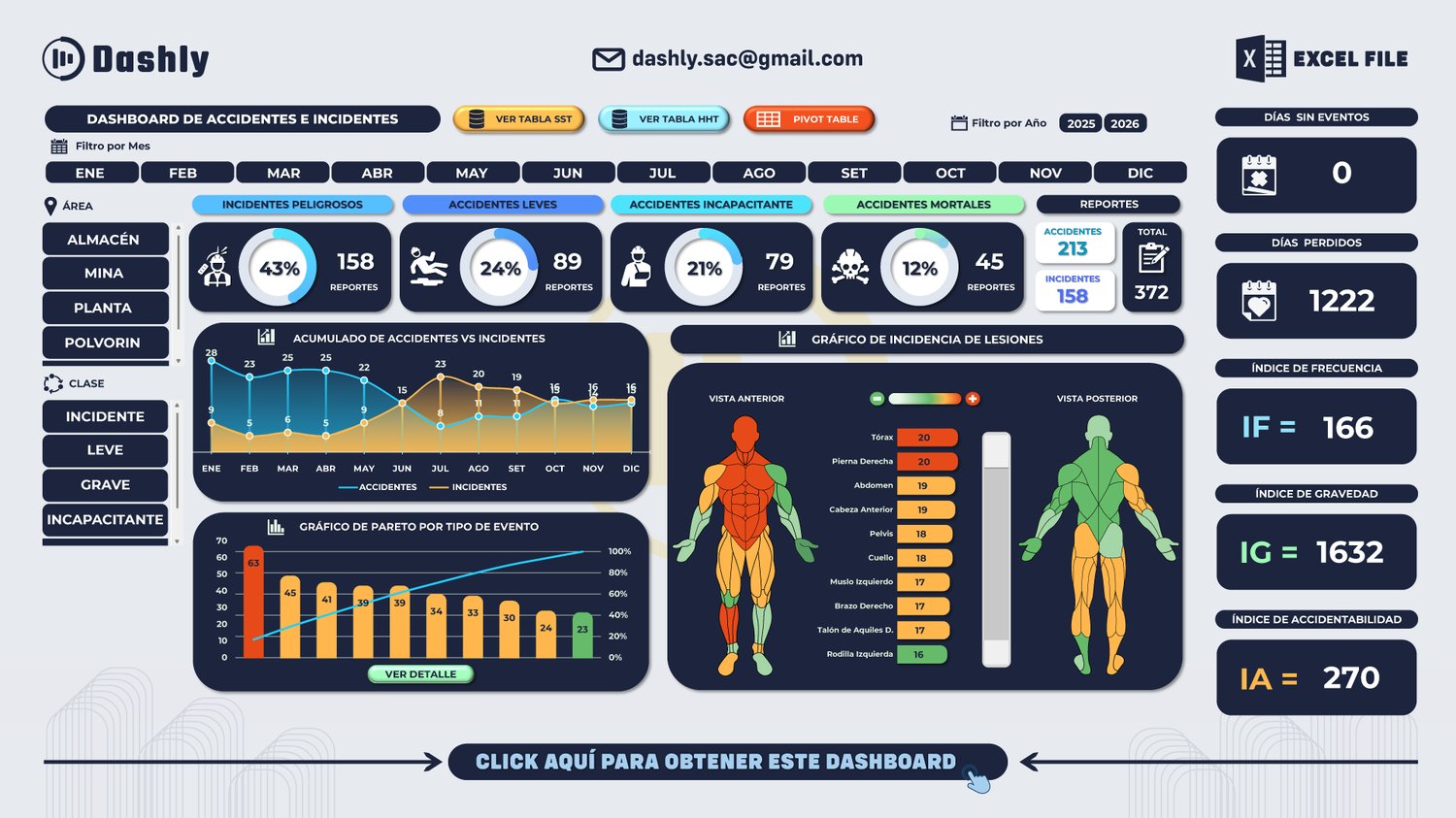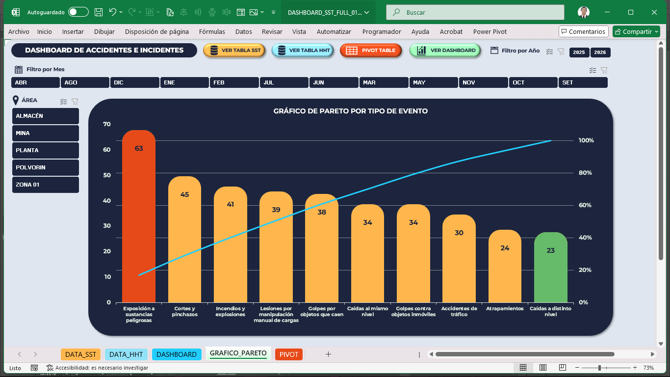 - Filtros dinámicos por mes, área o zona, y clase de evento (incidente peligroso, accidente leve, grave o incapacitante).