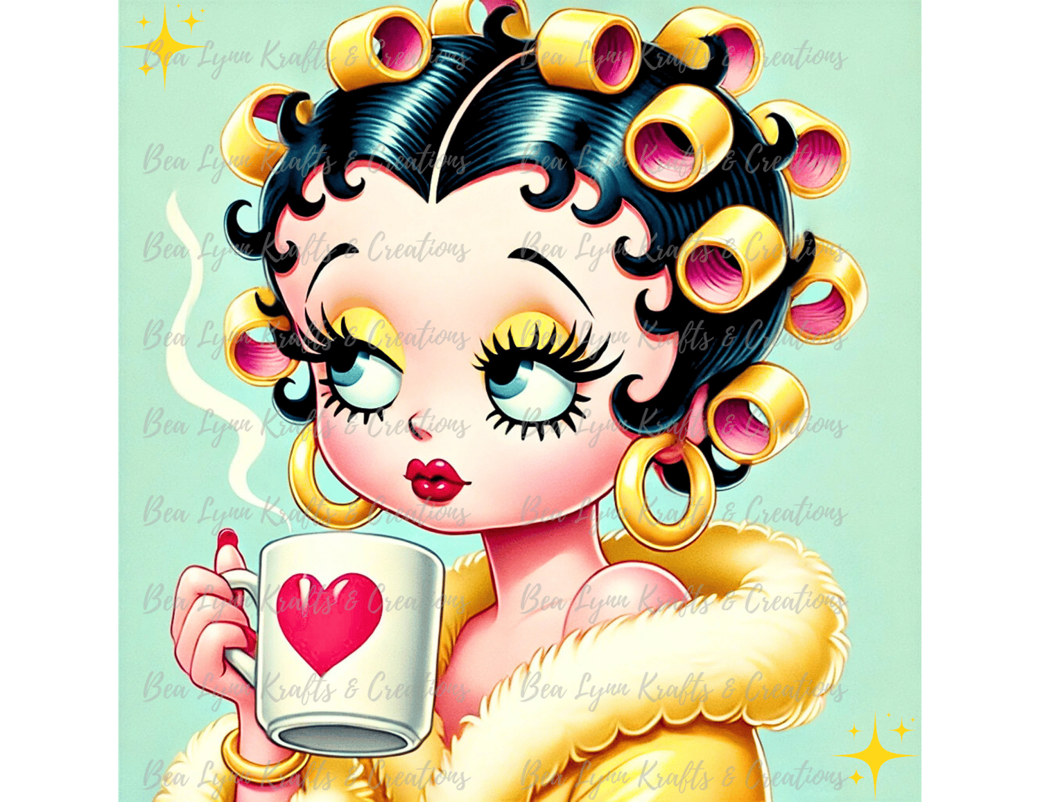 Betty Boop Golden Morning Glam PNG – Rollers, Coffee & Retro Shine!