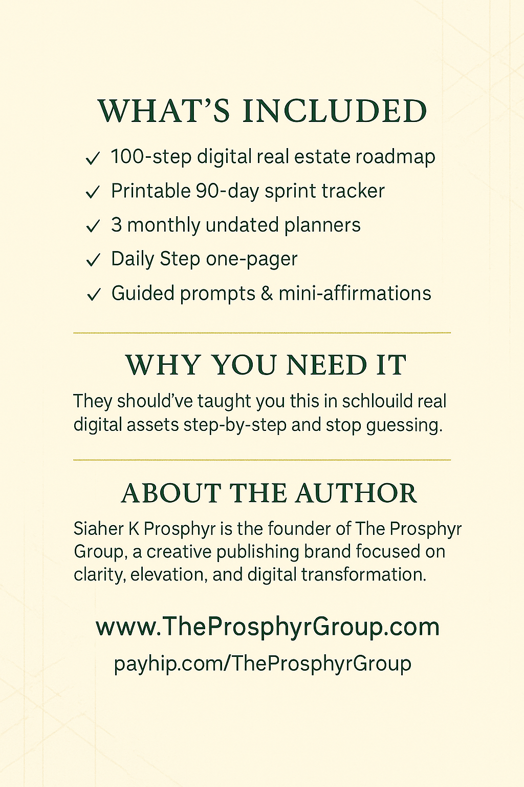 Build your digital product empire in 100 clear steps. Daily checklist, 90-day sprint, planners, and tracker by Siaher K. Prosphyr.