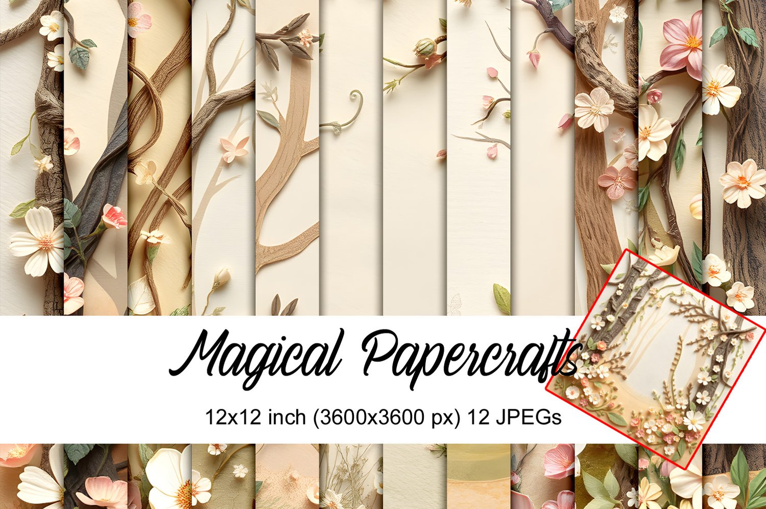 Step into a whimsical world where paper comes to life! Our Magical Papercrafts collection features 12 breathtaking digital papers designed to look like intricate, hand-crafted paper quilling art. Each design is a masterpiece of delicate paper flowers, winding vines, and textured wood-grain trees, all layered with a stunning 3D effect.