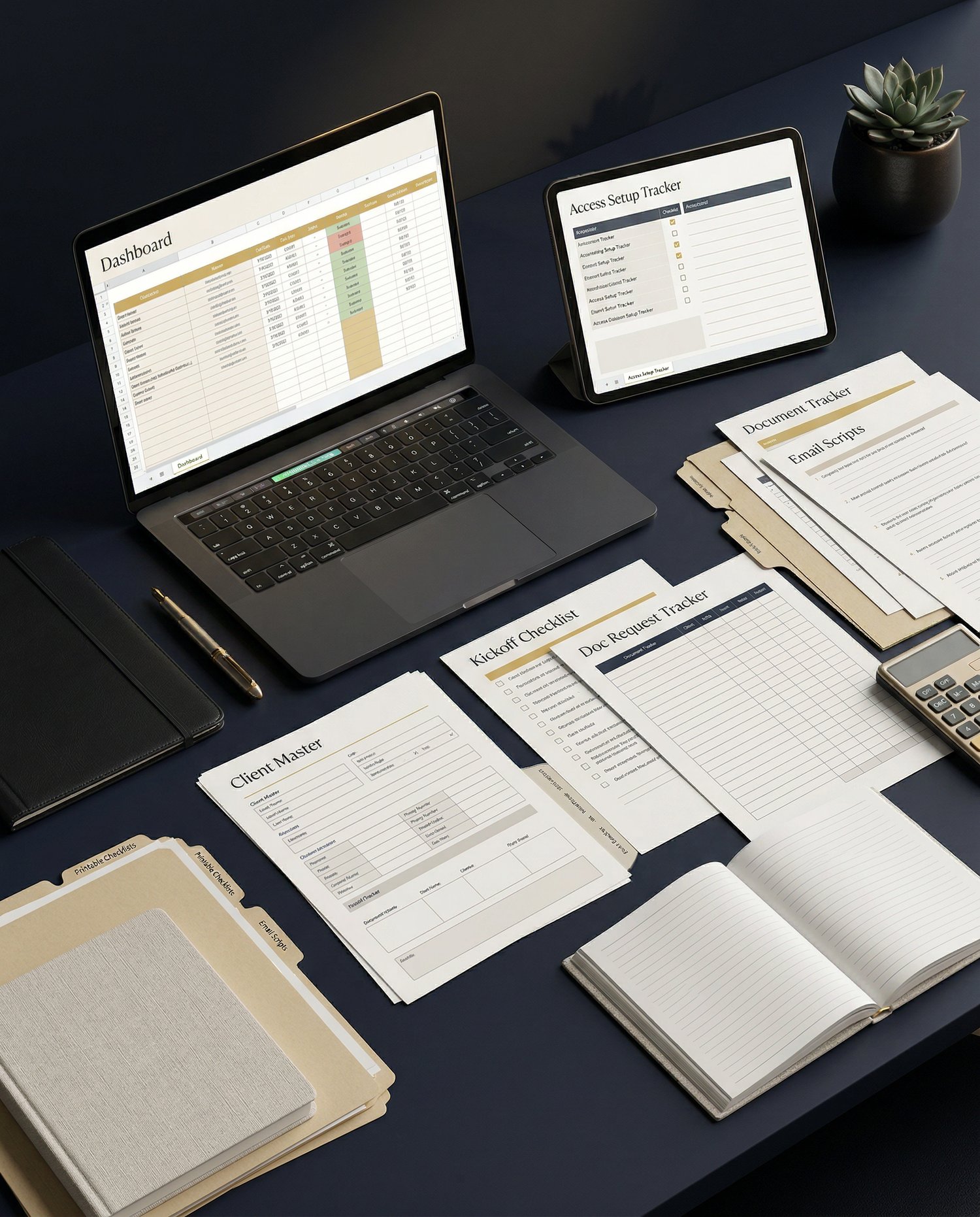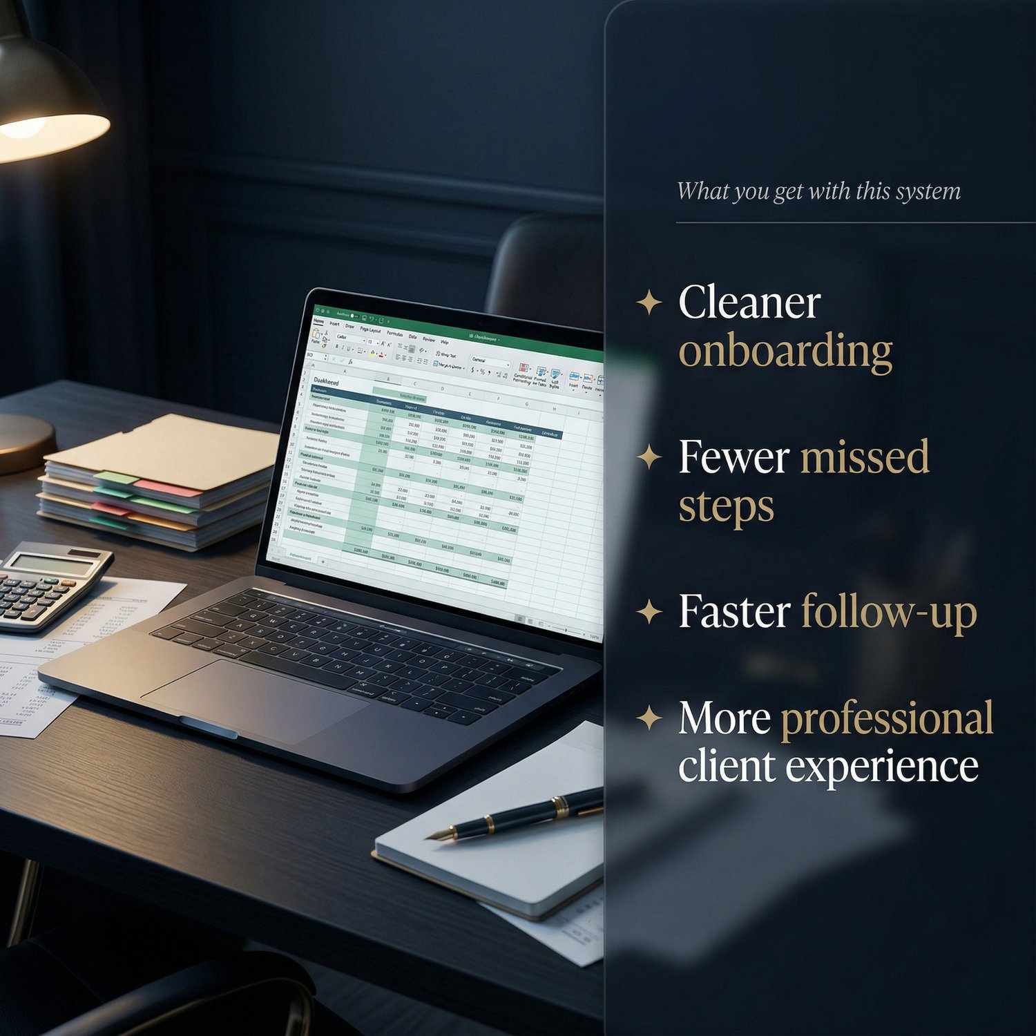 Inside this bundle, you get a fully editable Excel and Google Sheets workflow designed to help you move every new client through intake, document collection, access setup, follow-up, and kickoff with more clarity and less friction.