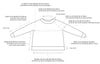 The pattern is written for nine sizes 1 [2, 3, 4, 5] [6, 7, 8, 9] to fit 74 [84, 94, 104, 114] [124, 134, 144, 154] cm // 29 [33, 37, 41, 45] [49, 53, 57, 61] in bust circumference with ca. 16-22 cm (6.25-8.75 in) of positive ease and a finished bust circumference of ca. 91 [100, 112, 124, 135] [144, 156, 165, 176] cm // 35.75 [39.25, 44, 48.75, 53] [56.75, 61.5, 65, 69.25] in.The sample is shown in size 2 on a 160 cm (5.3 ft) tall model with ca. 84–66–94 cm (33–26–39 in) body measurements. For more of the finished garment measurements, please refer to the schematic above.