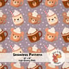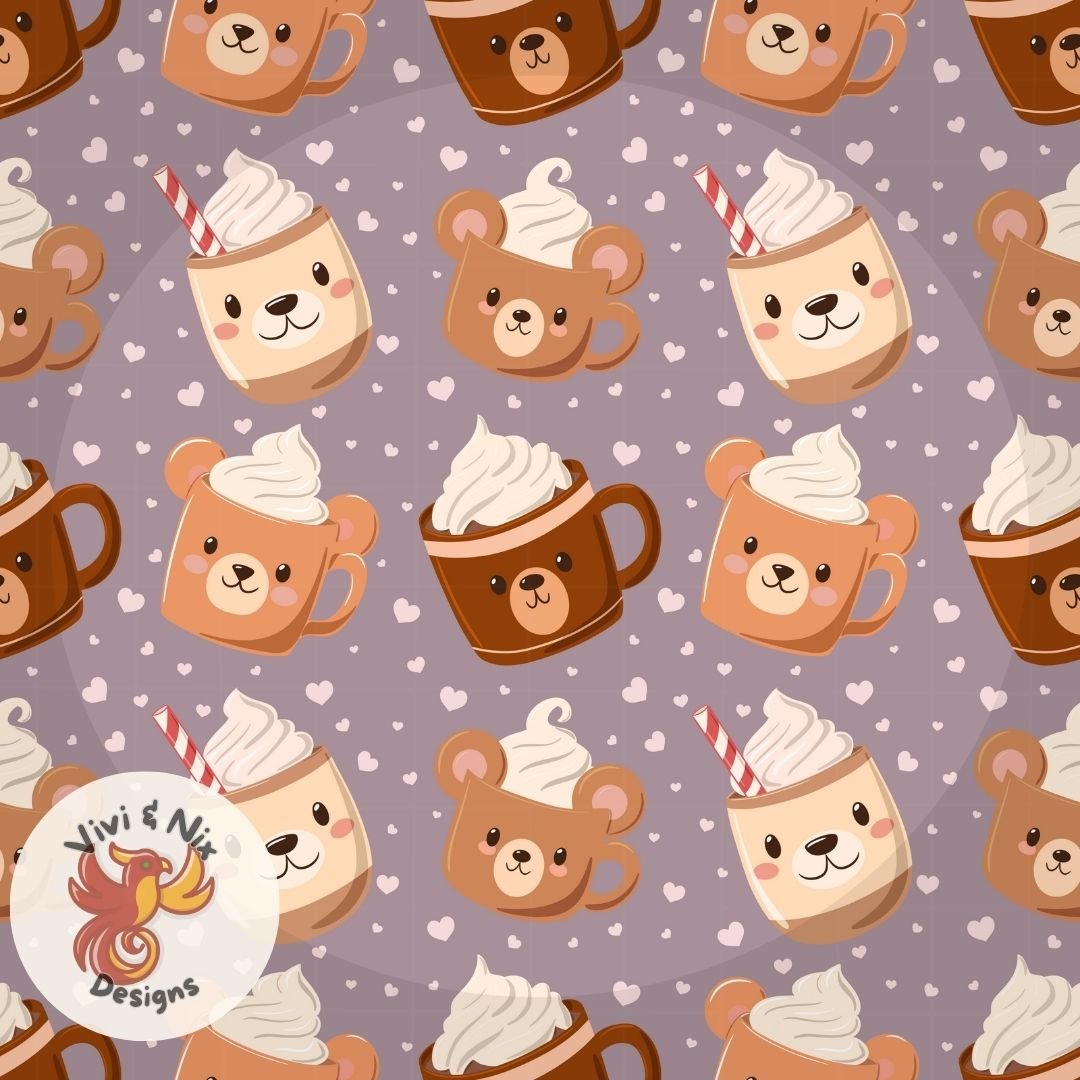 A cozy Valentine seamless pattern featuring adorable bear mugs filled with hot chocolate and tiny hearts — perfect for tumblers, sublimation, and handmade designs.