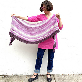 Marcella (the shawl, not the woman) is crescent shaped and contains all sorts of fun stitches, from “made-up” increases to scallops and slipped stitches. The final color (D) is only used for the border and is placed there to accent the rest of the colors. It does not have to be the strongest color, just a color that you love. If you do not wish to do the 2 rows of stranded knitting that occur several times in the shawl, you can simply revert back to stockinette stitch as instructed. Of note, colors that blend too much together will obscure the scallops.