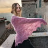 This shawl is a top-down triangle with a filigree pattern that mixes colorwork with Japanese wrapped stitches.