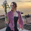 The colors and the intricate stitch pattern remind me of the cherry blossoms used by Madame Butterfly to decorate her home when she learned of her beloved’s arrival.