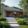 The exterior rendering showcases a biophilic architectural style — a flat concrete roof integrated with vegetation, natural wood cladding, and large glass openings that blur the line between indoor and outdoor spaces. Surrounded by lush landscaping and a serene garden path, the home embodies sustainable living, perfect as a nature-inspired weekend retreat or eco-friendly getaway home.