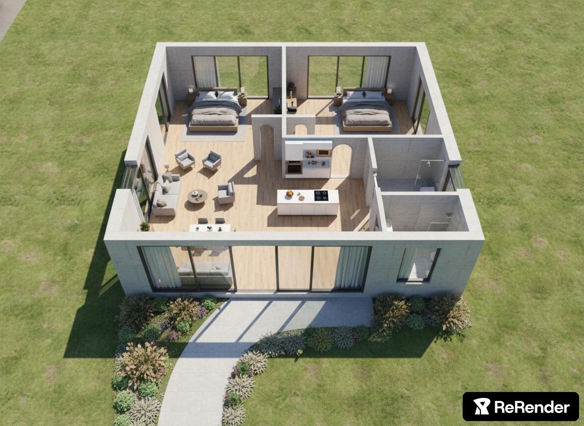 This modern biophilic vacation home blends natural harmony with minimalist architecture, designed for comfort and sustainability. Covering 103 square meters, the house features a spacious open-plan living and dining area (9.0 × 4.0 m) that connects seamlessly to the outdoors, promoting relaxation and a sense of tranquility.