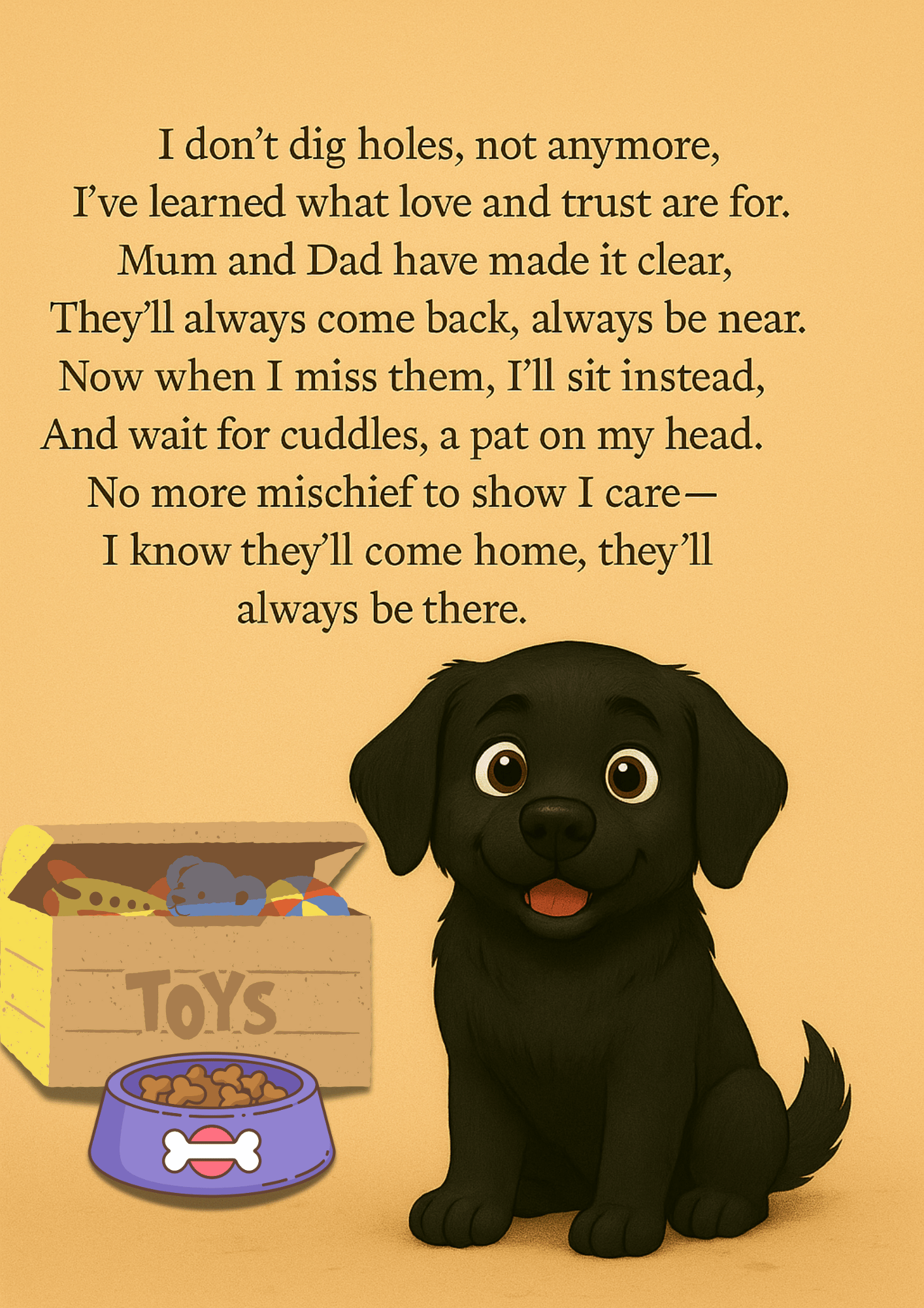 When Diggy feels lonely, he digs secret holes, hoping it will bring his parents home sooner. But soon, Diggy discovers that mischief won’t fill the emptiness — love and trust grow when he shares his feelings instead.