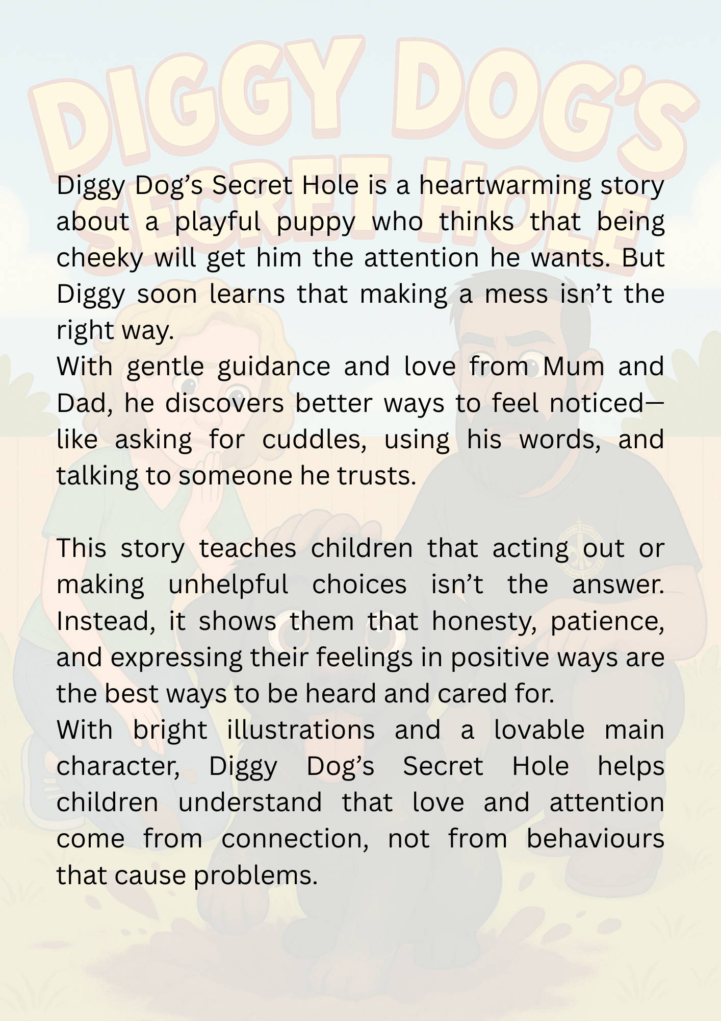 Perfect for young readers, Diggy Dog’s Secret Hole is a heartwarming children’s story about mischief, loneliness, and learning the power of communication.