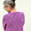 The stitch pattern is a combined cable and ridged feather and fan repeat. The feather and fan stitch pattern creates a bend in the otherwise straight ridges, and also joins the cables horizontally. The ridges extend from the pattern panel to the sides of the body and sleeves. The background texture comprises of contrasting sections of stocking stitch and double seed stitch. The drop sleeves have a section of curved cables placed centrally.