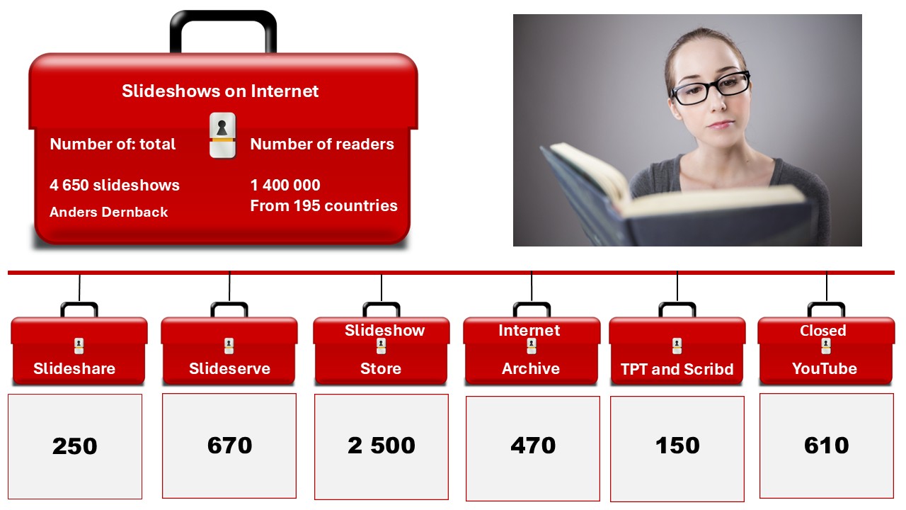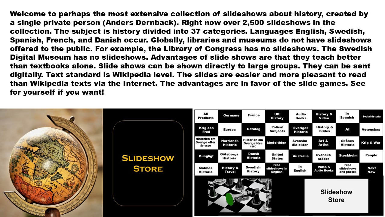 Bildspel, ljudböcker, filmer, foto att ladda hem. 80 % är gratis, resten kostar 2 - 4 USD.
