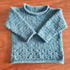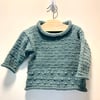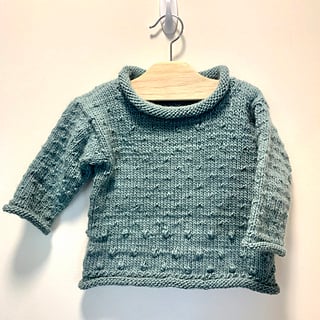 The Buggle is knitted bottom-up as one piece until the sleeves when the fronts and back are knitted separately. Sleeves are picked up at the armholes and then worked top down. There are small bobbles on the body and a simple pattern with purl stitches. The cuffs and collar are rolled.