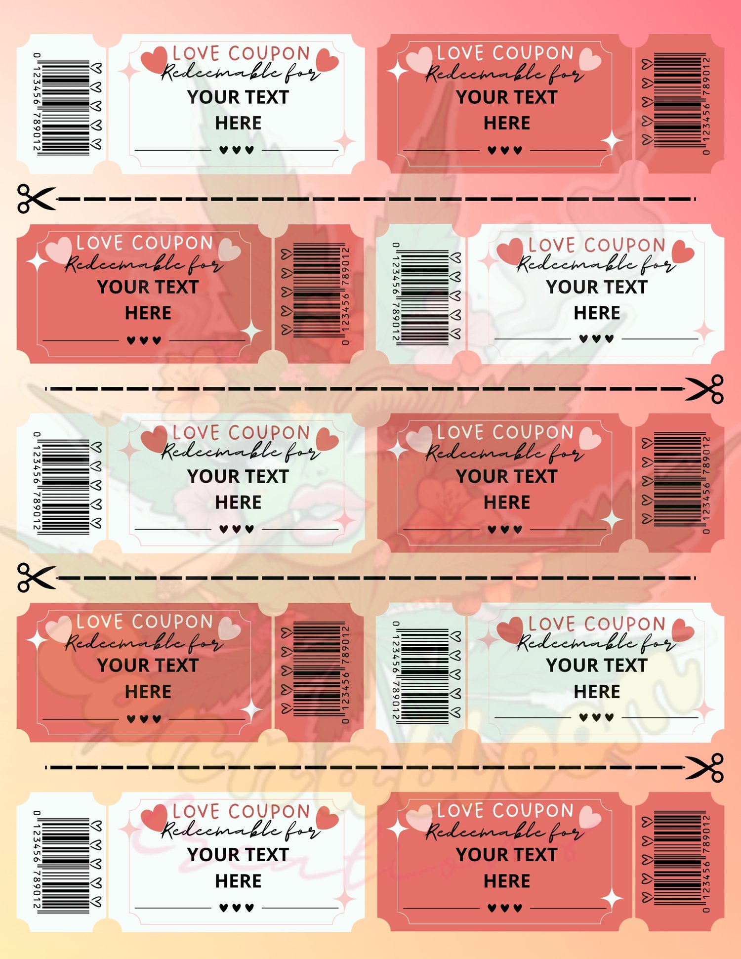 30 Editable Love Coupons - 3 pages (10 coupons per page) of 24 completed ready to print & cut coupons + 6 WILD CARD options PLUS fully customizable template