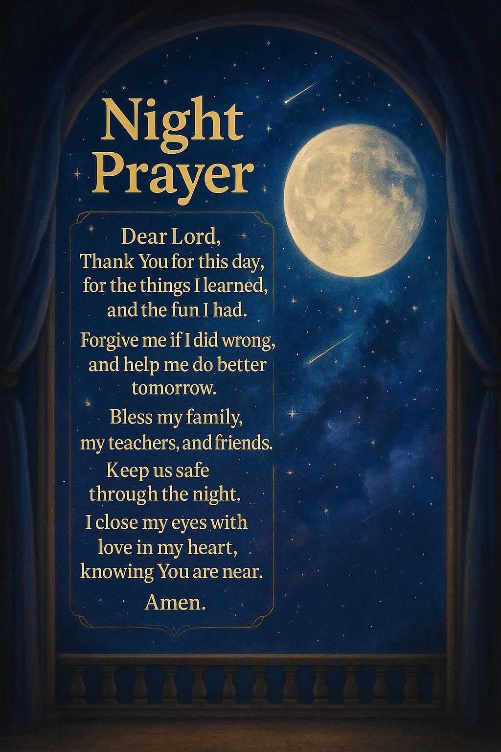 Wrap little hearts in peace with this Christian wall art featuring a gentle night prayer. Designed with a starry sky, glowing moon, and cozy arched window, this printable invites gratitude, forgiveness, and divine protection before sleep. Perfect for children’s ministry kits, bedtime devotionals, and healing bundles.