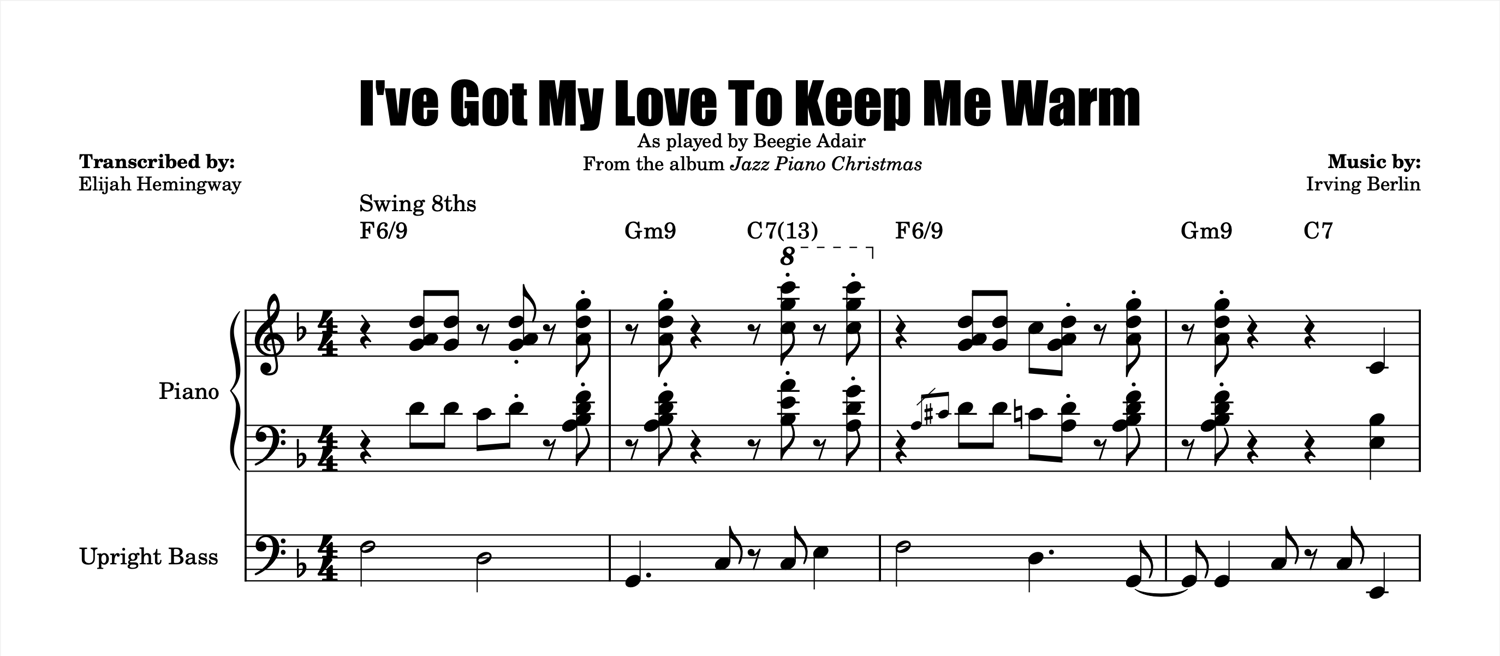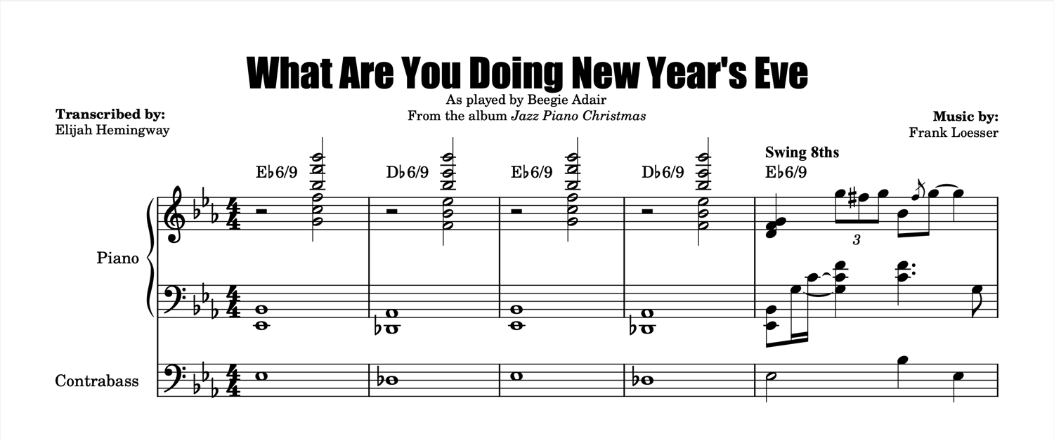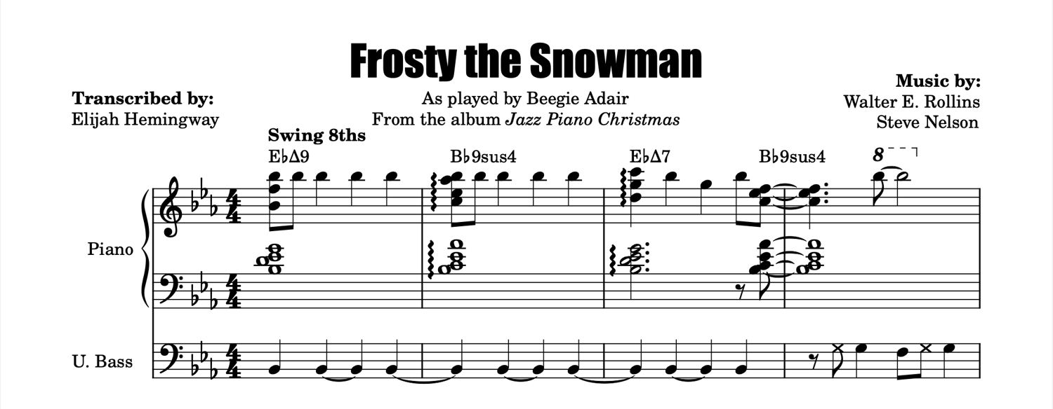 This package includes 12/12 transcriptions from Beegie Adair's album Jazz Piano Christmas. The piano and bass from each track have been transcribed with chord symbols. This bundle will SAVE $20 (versus $120 separately, buying each piece priced at 10 dollars).