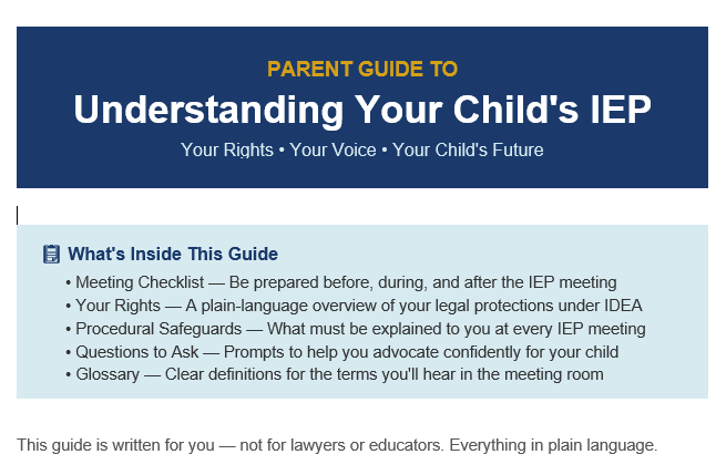 This is an all in one IEP Parent Guide and Workbook that breaks down all the parts of the IEP in plain language with explanations of your rights and workbook pages to organize your thoughts and prepare for any upcoming meeting.