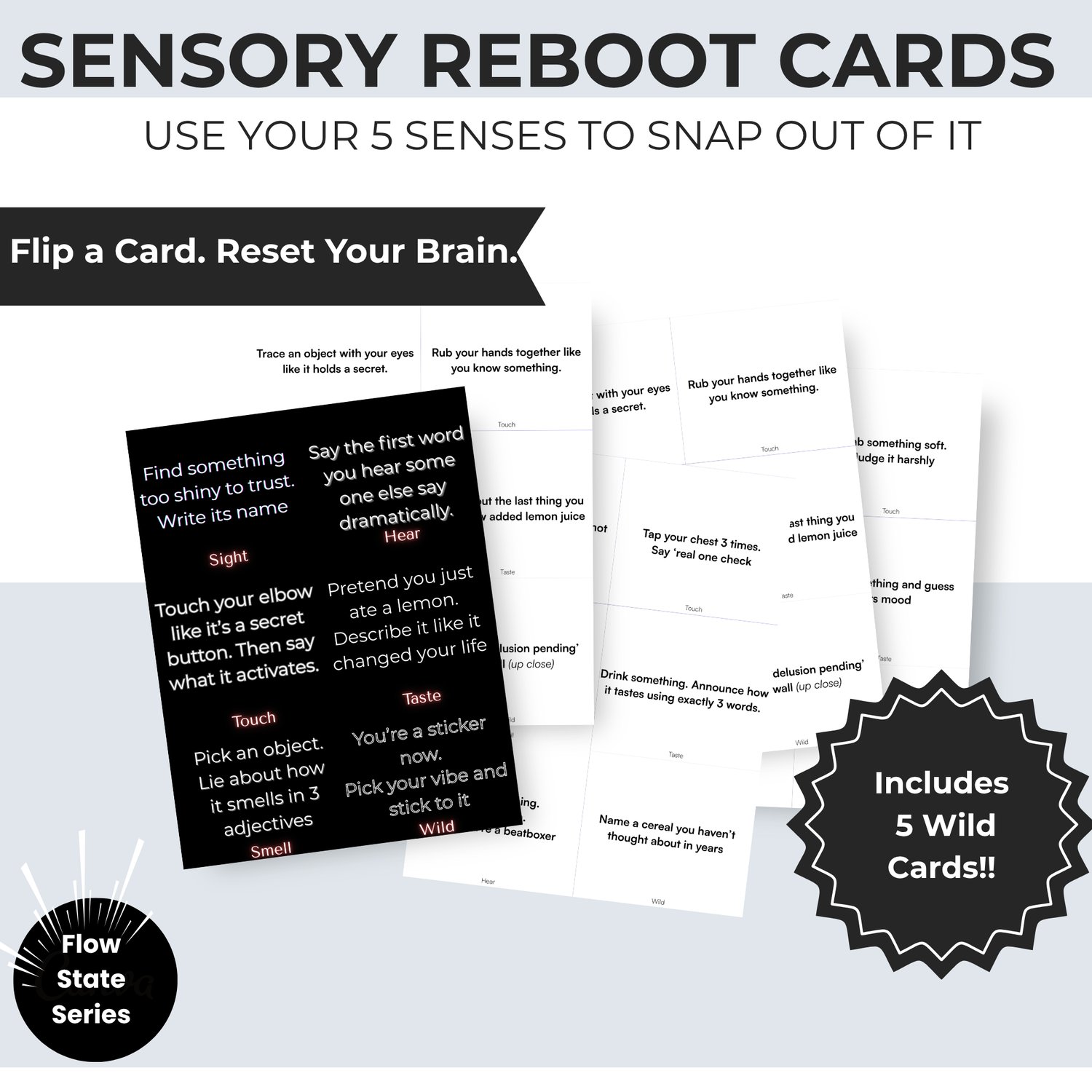 Flow State is your pocket-sized focus reset. Each card gives you a quick, sensory-based cue to pull you out of distraction and back into momentum. Perfect for work breaks, study sessions, or anytime your brain needs a gentle nudge back on track. Makes a thoughtful, no-fuss gift for a friend who’s always juggling a million things.