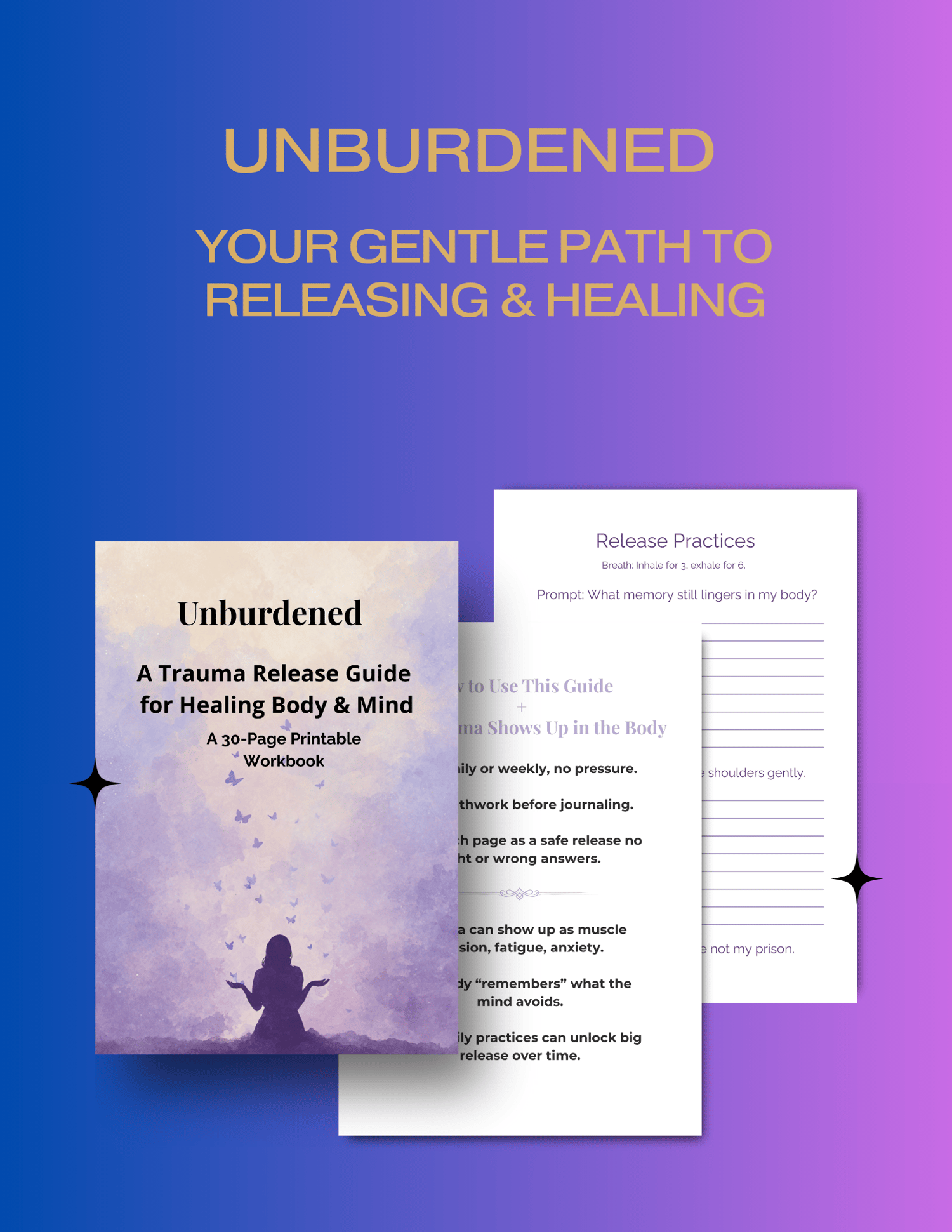 Find your safe space to heal with Unburdened. This 30–page printable trauma release guide combines gentle breathwork, journaling prompts, body release practices, affirmations, and reflection pages. Designed to help you release what weighs heavy, reconnect with your body, and create a sense of peace — at your own pace. Perfect for anyone seeking healing, self-care, and mindful reset in daily life.