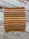 Sample was knit with a 5 skein mini set of non-superwash fingering weight yarn naturally dyed by Wooly Witch of the West. The main color is The Fiber Co. Cumbria Fingering “Catbells’. I used 52g of the MC and just over 6g of each CC. There is a matching fingerless mitts pattern as well, with the same yarn. You can knit both the cowl and the mitts with 100g of MC and 10g of each CC.